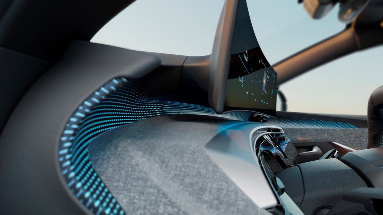 - Una pantalla panorámica flotante con curva de 21 pulgadas de alta definición que agrupa el Head-up Display y la pantalla táctil central.