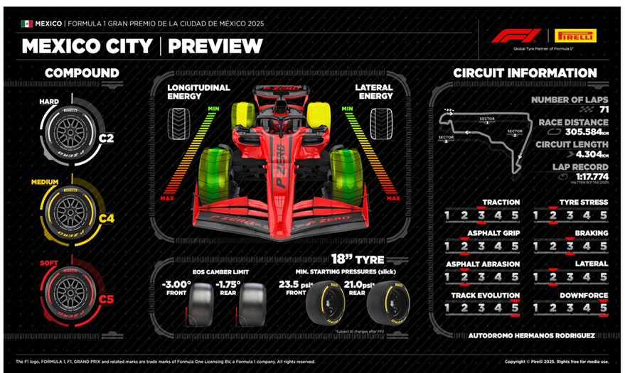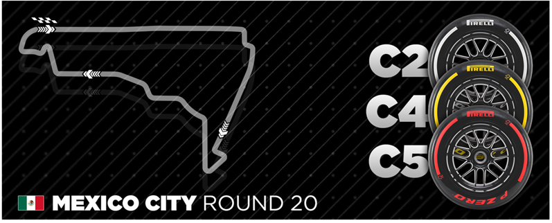 Al igual que en Austin el fin de semana pasado, para la ronda mexicana se ha vuelto a dar un salto en la selección de compuestos, entre el más duro de los tres y el medio. Mientras que el Medio y el Blando son el C4 y el C5 respectivamente, el Duro será ahora el C2. Para la pista de la Ciudad de México, este compuesto es una opción extremadamente conservadora, con una diferencia considerable en el tiempo de vuelta en comparación con los otros dos, además de ofrecer menos agarre.