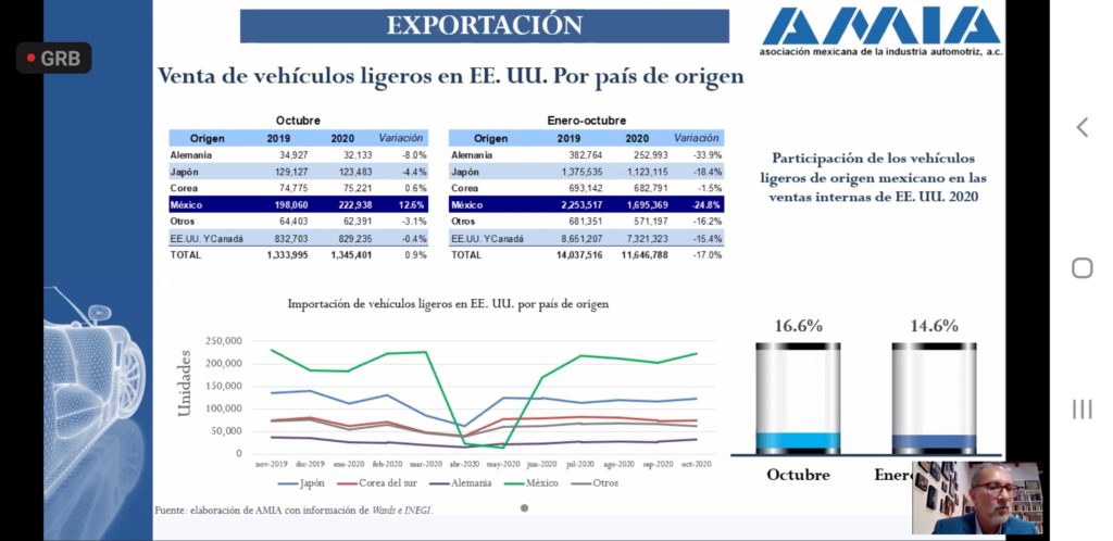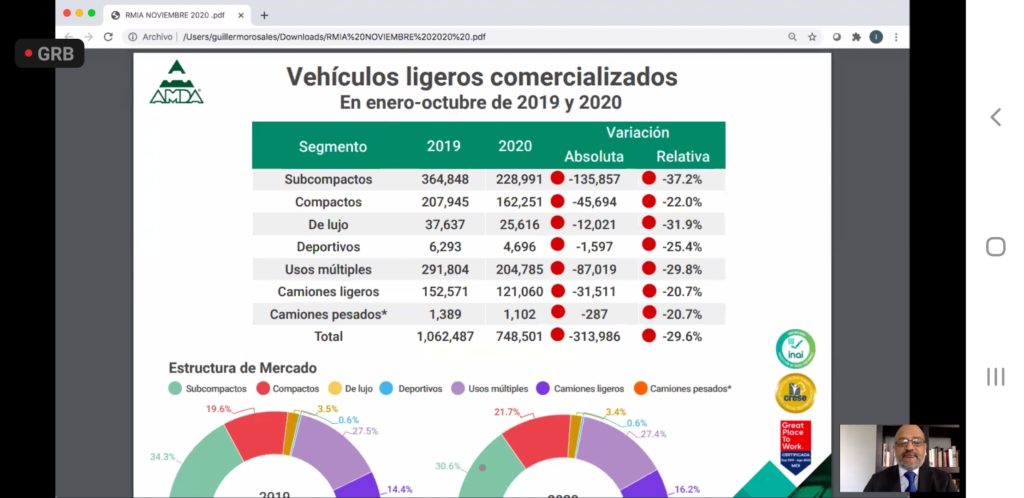 Por su parte, Guillermo Rosales, vicepresidente de la Asociación Mexicana de Distribuidores de Automotores (AMDA), dijo que en las ventas 21.3% se tuvo una caída en las ventas en octubre de este año, frente al mismo mes del año pasado. En el que prácticamente todos los segmentos cayeron, excepto en camiones pesados que tuvo un alza en la Clase 3.