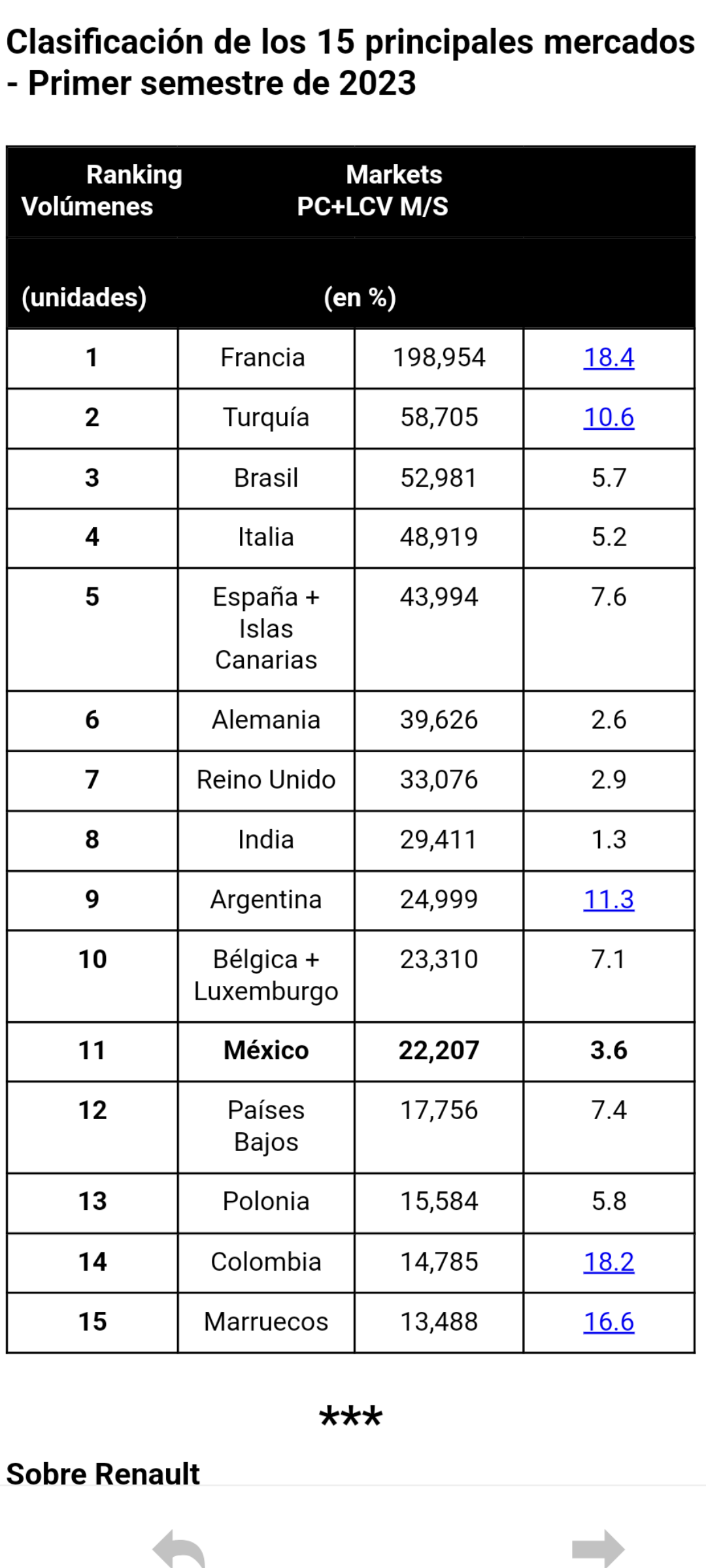 - Las ventas mundiales de Renault en el primer semestre alcanzaron las 770,807 unidades*, un 11% más que en el primer semestre de 2022. La marca aumenta su cuota de ventas en los canales más rentables y en los segmentos que crean valor.