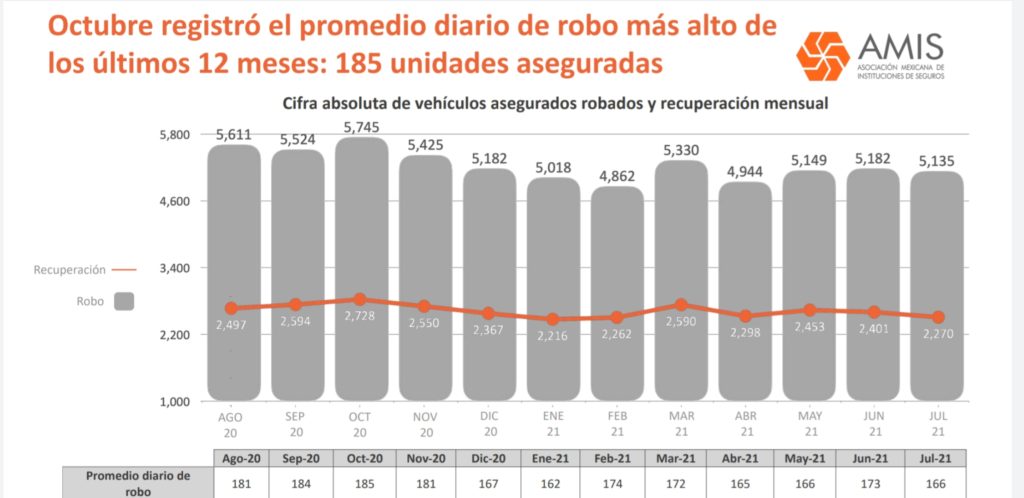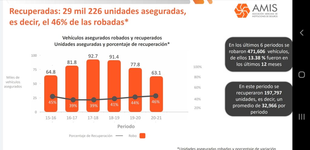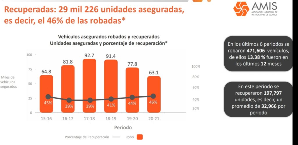 De acuerdo con información de la Asociación Mexicana de Instituciones de Seguros (AMIS), los vehículos recuperadas fueron por 29, 226 unidades aseguradas, es decir, el 46% de las robadas.