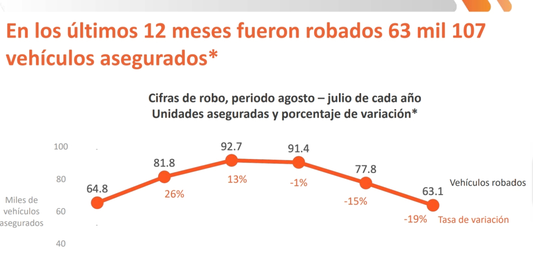 Con ello, se informa que los amantes de los ajeno se robaron 63,107 unidades en los últimos 12 meses, lo que fue inferior a los 77,781 robos del año anterior, y con ello una caída del 19%.