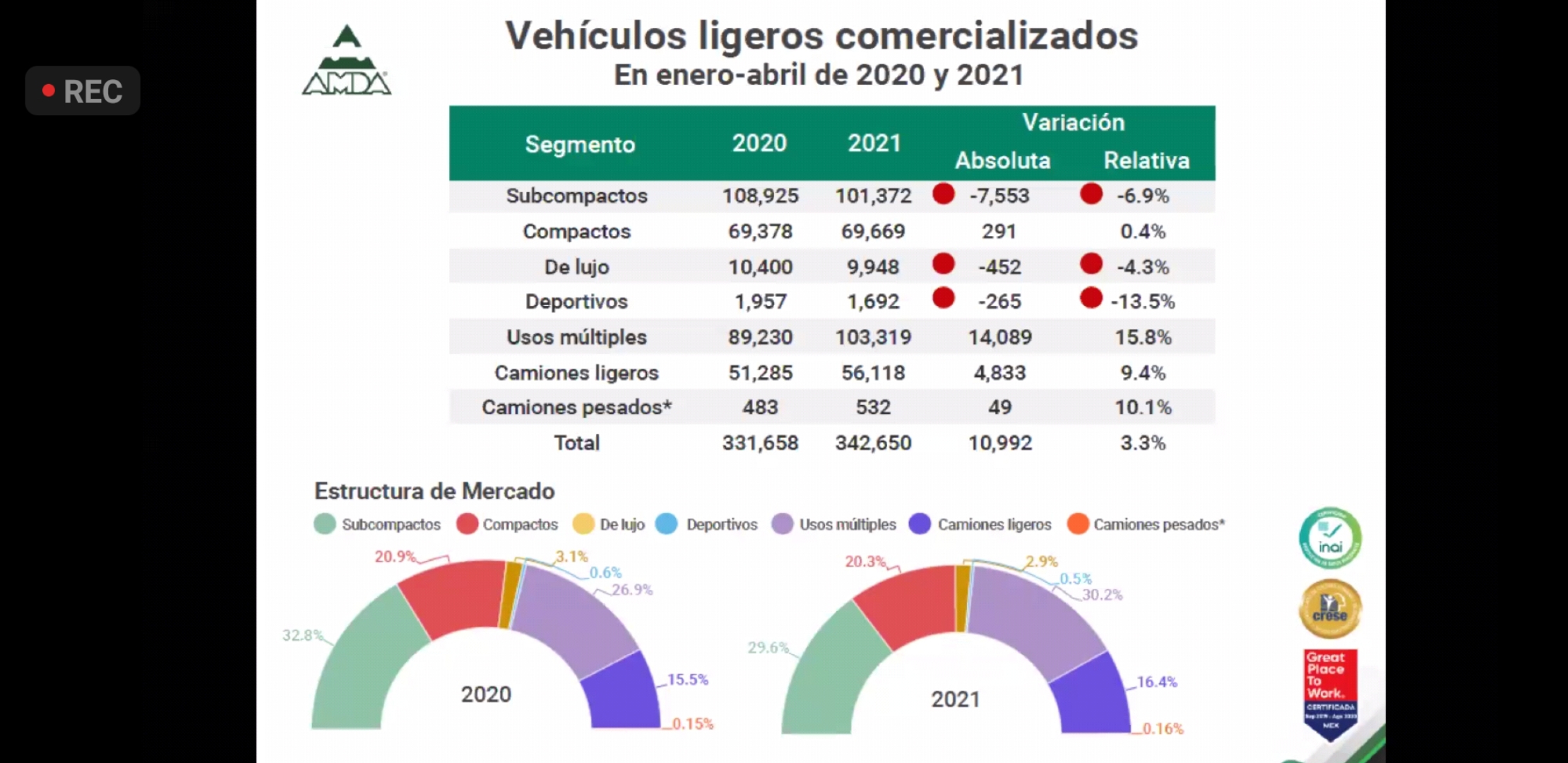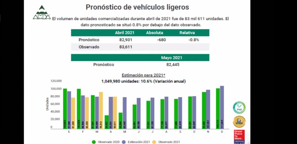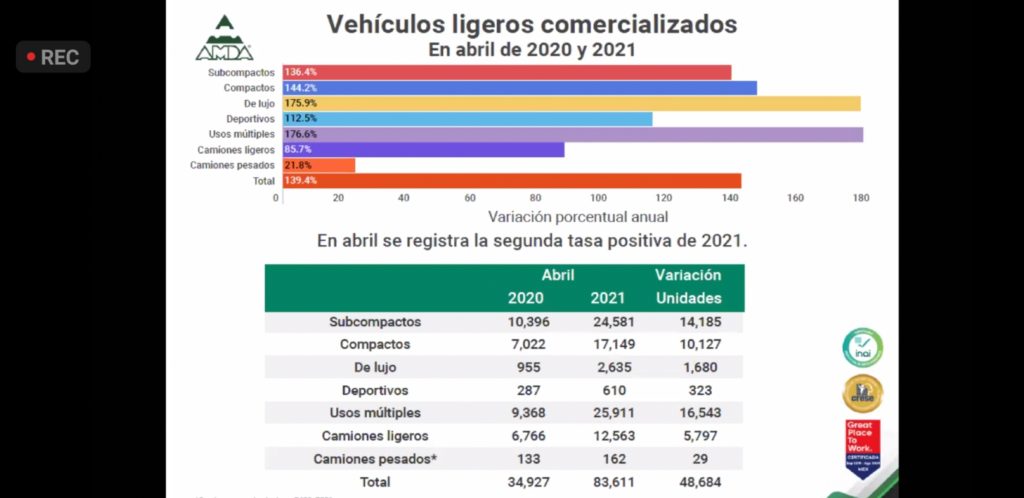 En abril de este año se vendieron 83,611 unidades, lo que representó un alza de 139.3% respecto a abril del 2020, con una diferencia de 48,684 vehículos de más. Y para el mes de mayo, se estima una comercialización de 82,445 de unidades.