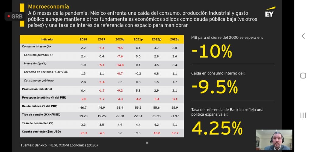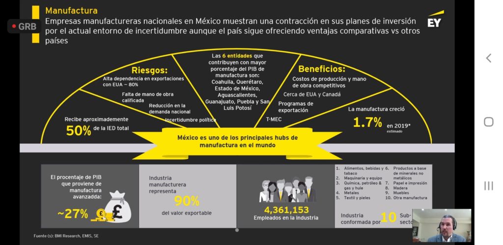 Sector manufacturero que enfrenta como país un crecimiento negativo estimado en un 10%; un presupuesto público a la baja; aunque con un nulo crecimiento de la deuda pública, con tasas de interés de referencia a la baja; con un ambiente complicado a nivel México con Pandemia y transformación. Y con una incertidumbre política.