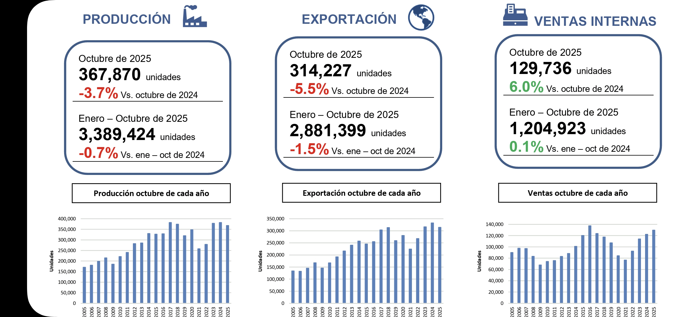 En el acumulado de enero a octubre, se han producido más de 3.3 millones de unidades, cifra que refleja un ligero descenso de 0.7% respecto al mismo periodo de 2024.