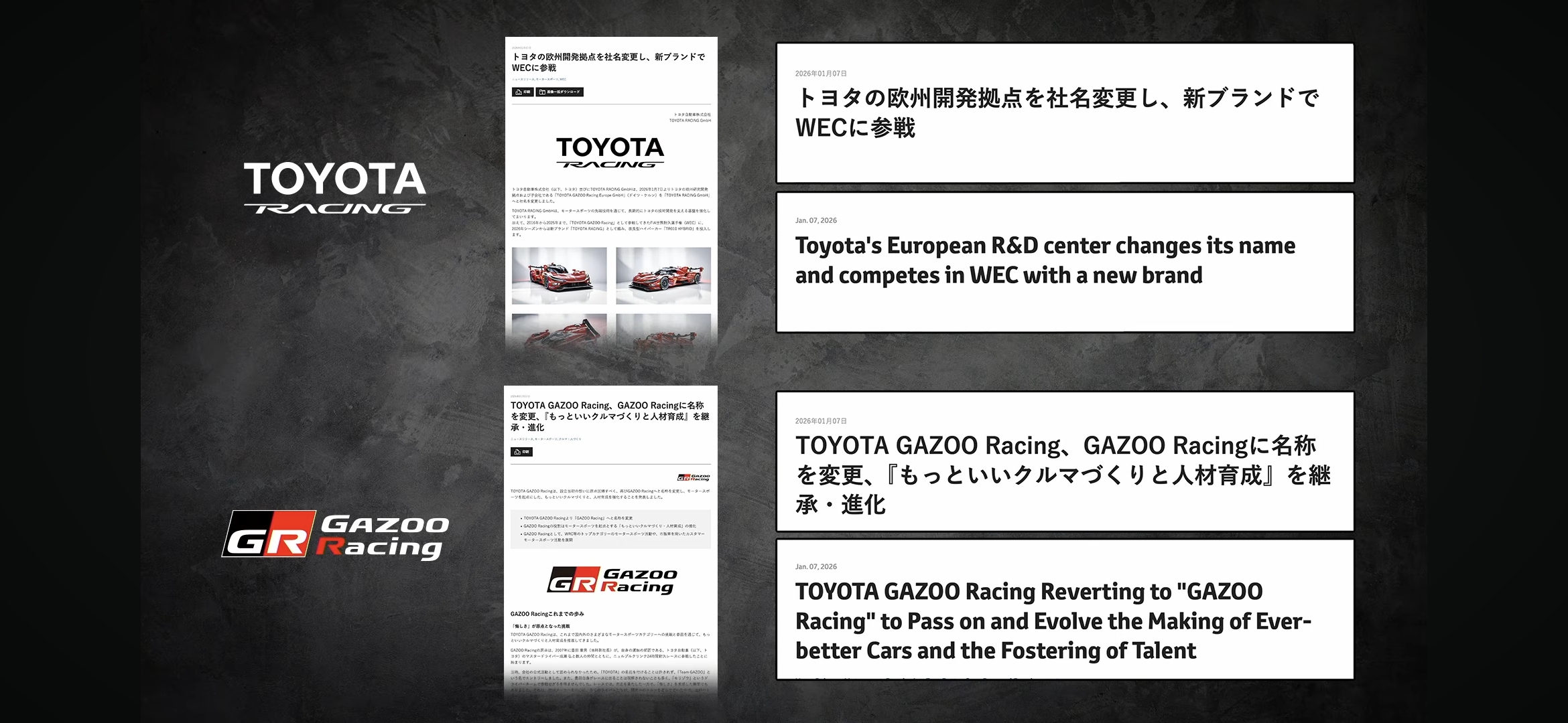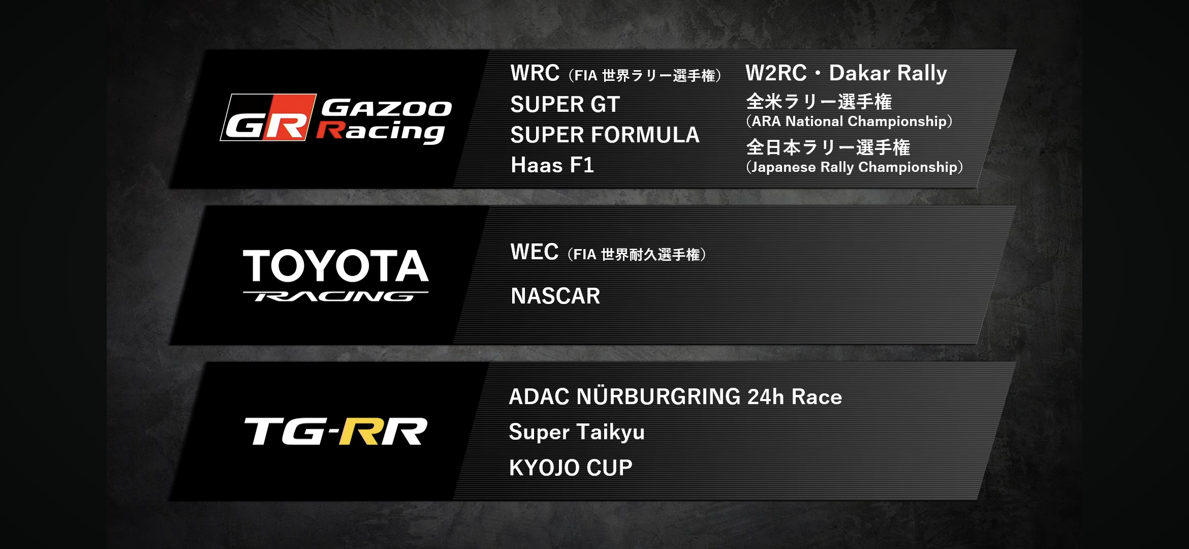 La gran marca deportiva de Toyota es Toyota Gazoo Racing (TGR), decidió dar un giro, y ahora se conforma por tres grandes marcas: Toyota Racing (TR) para las carreras WEC y NASCAR; y GR Gazoo Racing para las carreras de SUPER GT, SUPER FORMULA, y Hass F1.