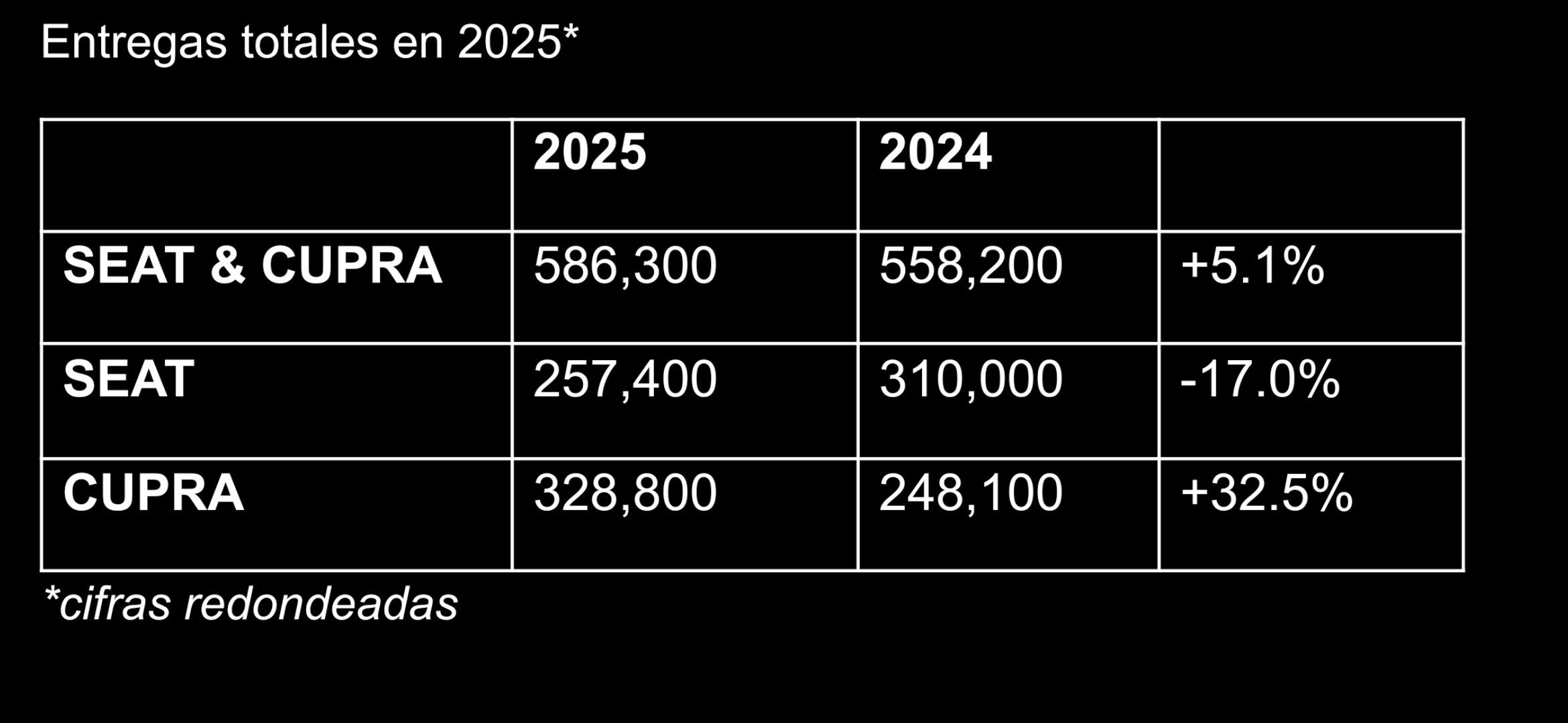 Un nuevo capítulo para SEATEn su 75 aniversario, la marca SEAT entregó 257,400 vehículos, un 17.0% menos que en 2024 (310,000).