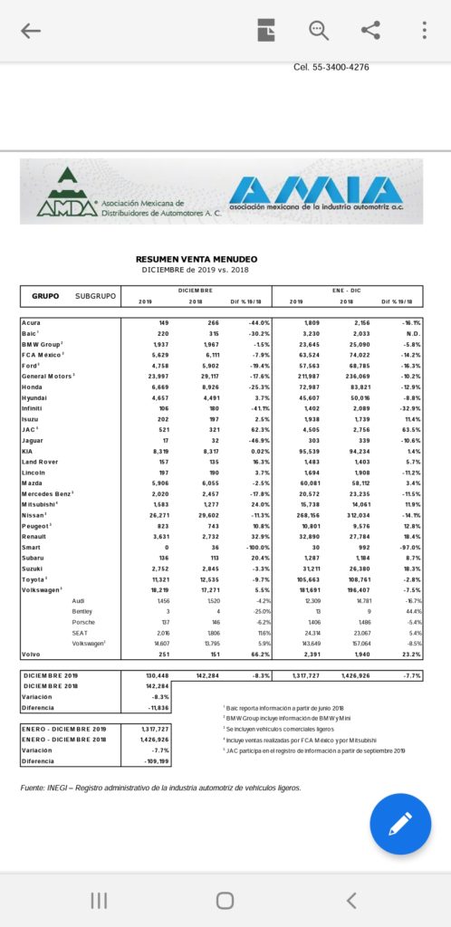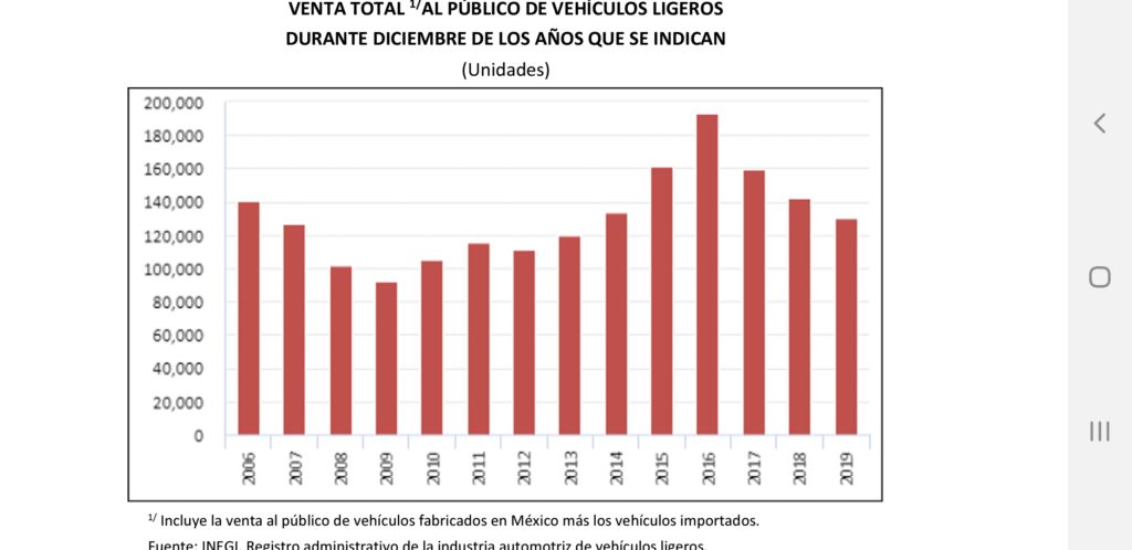 En diciembre del año pasado se vendieron 130,448 mil unidades, igualmente inferior a las 142,284 mil ventas de diciembre del 2018, es decir, 8.3 por ciento menos.