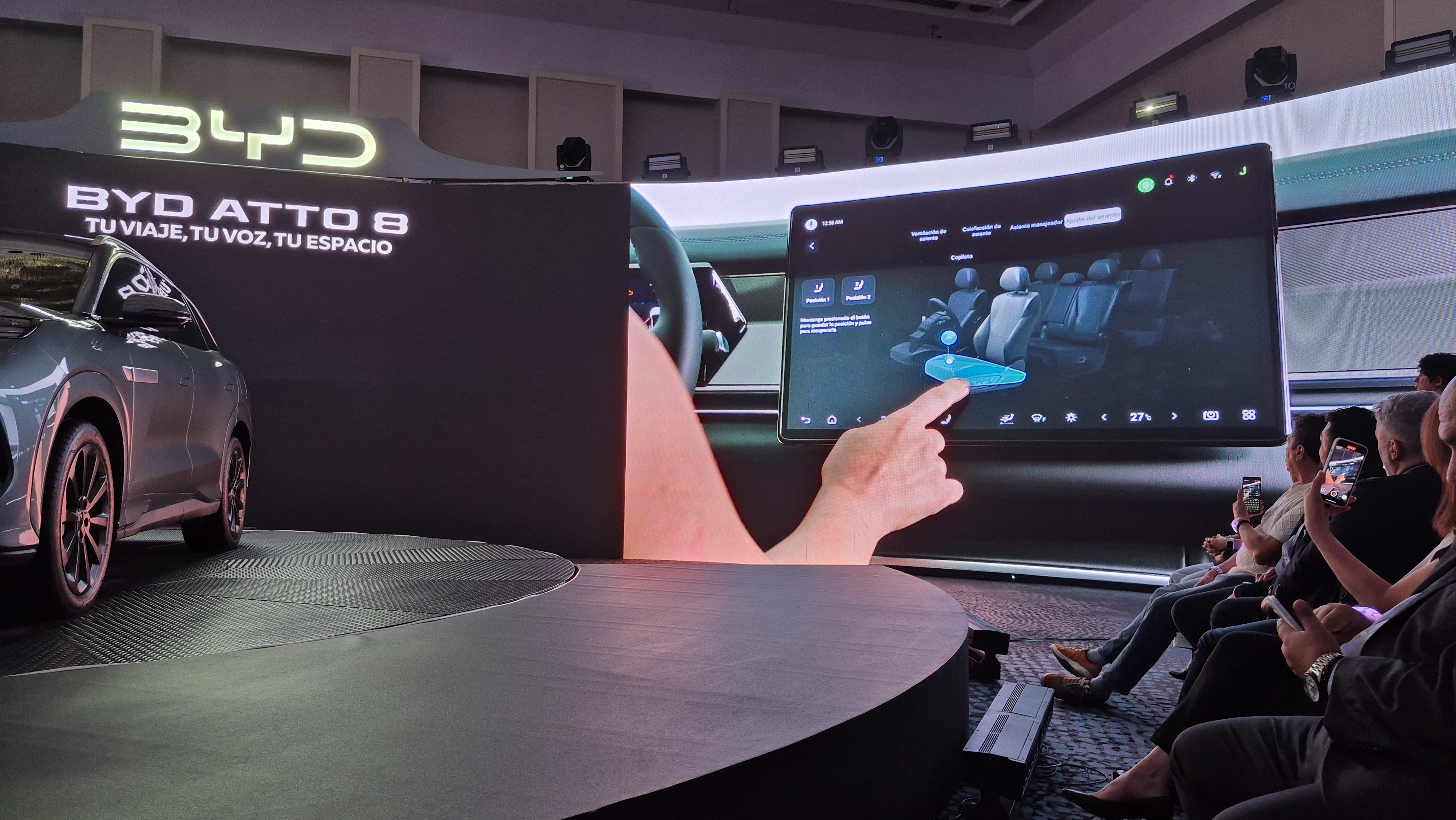 Esta camioneta ATTO 8, tiene tres hileras de asientos, cámara de 360 grados, una pantalla central de 16 pulgadas, asientos de piel calefactables.
