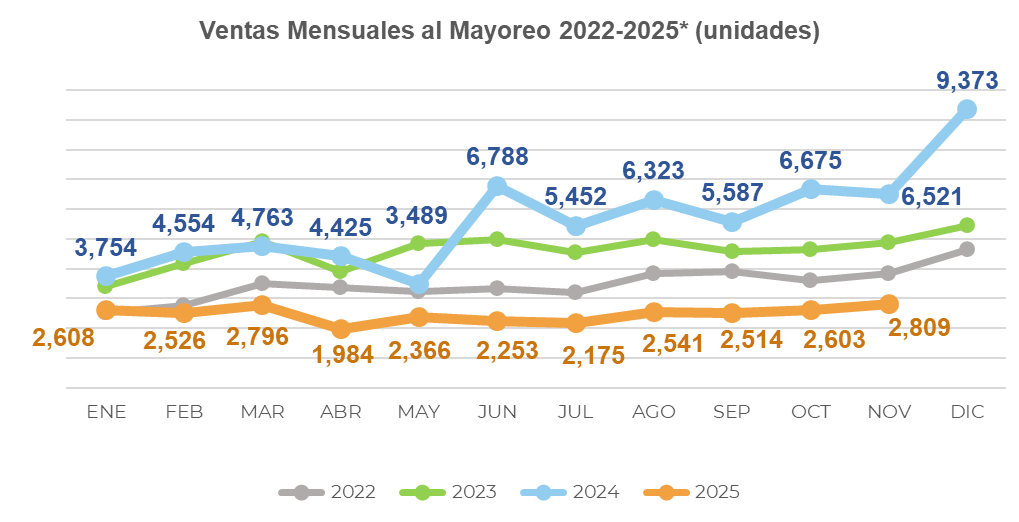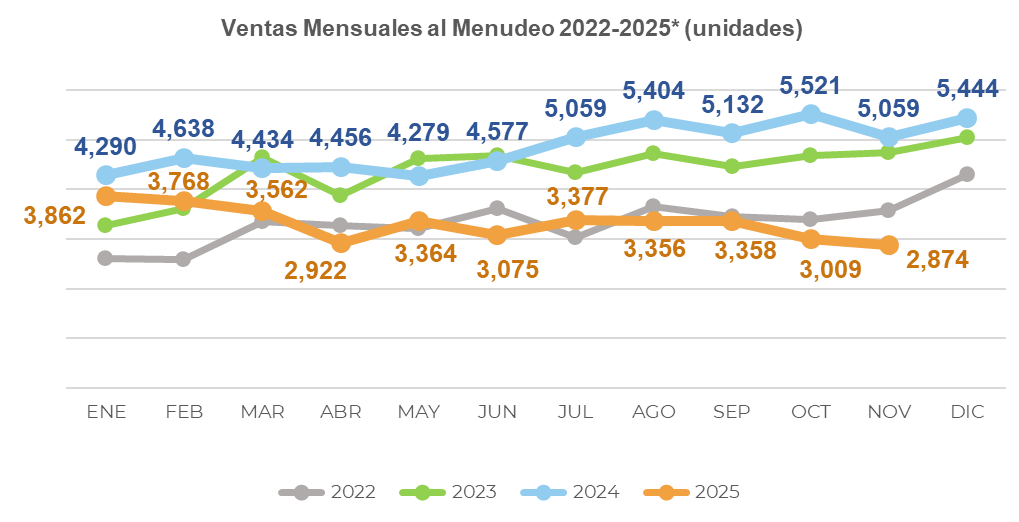 - El promedio de automotores vendidos en 2025 fue de 3,194, mientras que en 2023 fue de 4,217 y en 2024 de 4,672.