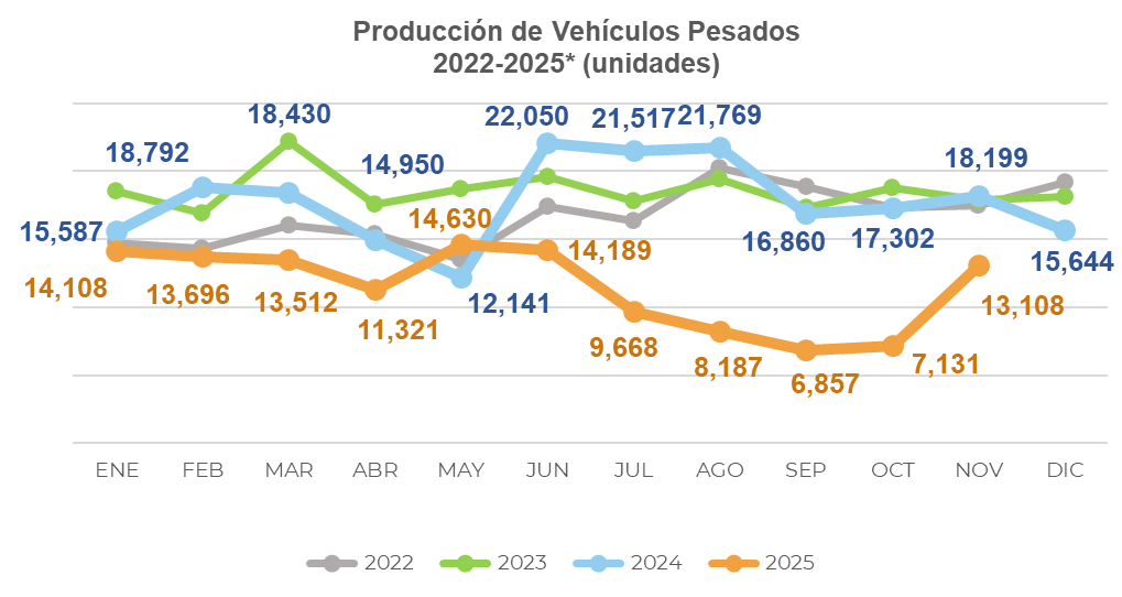 En cuanto a la producción, se ensamblaron 13,108 unidades de vehículos pesados durante noviembre de 2025, lo que refleja una disminución del 28.0% respecto al mismo mes de 2024. En el acumulado anual, la producción alcanzó las 126,407 unidades, lo que representa una baja del 36.0% en comparación con las 197,597 unidades producidas en el mismo periodo del año anterior. No obstante, se observa un repunte en la producción de vehículos pesados en el mes de noviembre del 83.8% con respecto al mes anterior.