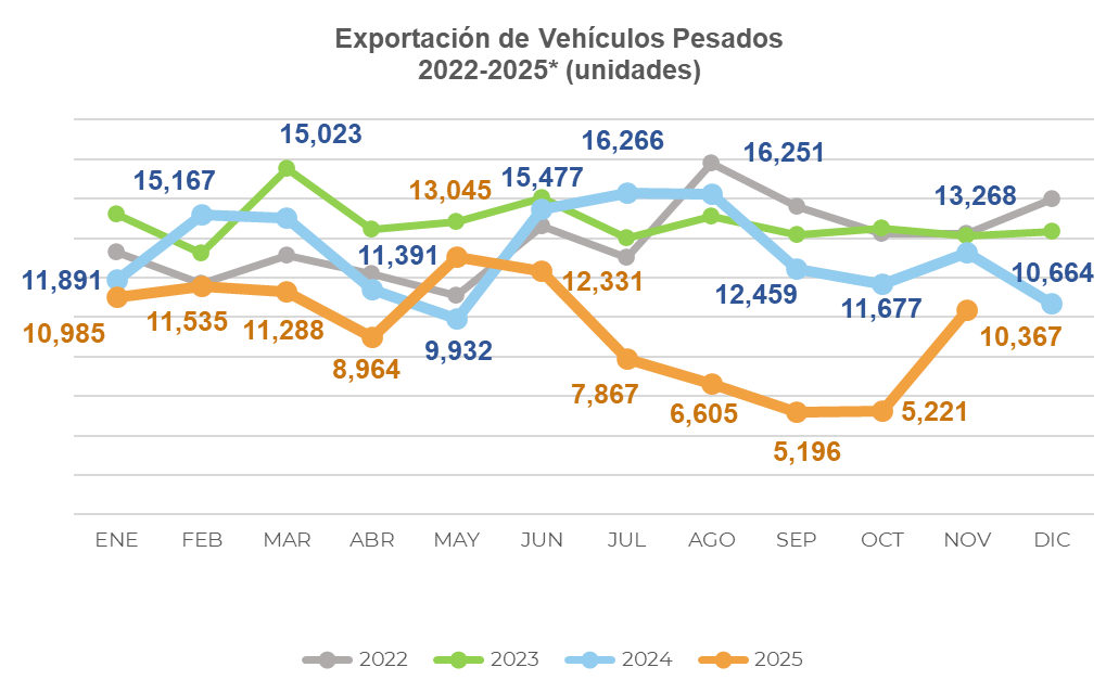Respecto al mercado internacional, se exportaron 10,367 unidades de vehículos pesados en el mes, lo que significó una disminución del 21.9% en relación con el mismo mes de 2024. A nivel acumulado, las exportaciones sumaron 103,404 unidades, lo que representa una baja del 30.5% frente a las 148,802 unidades exportadas en el mismo lapso del año anterior. En el mes de noviembre, se observó un repunte en las exportaciones de 98.6% con respecto al mes anterior.
