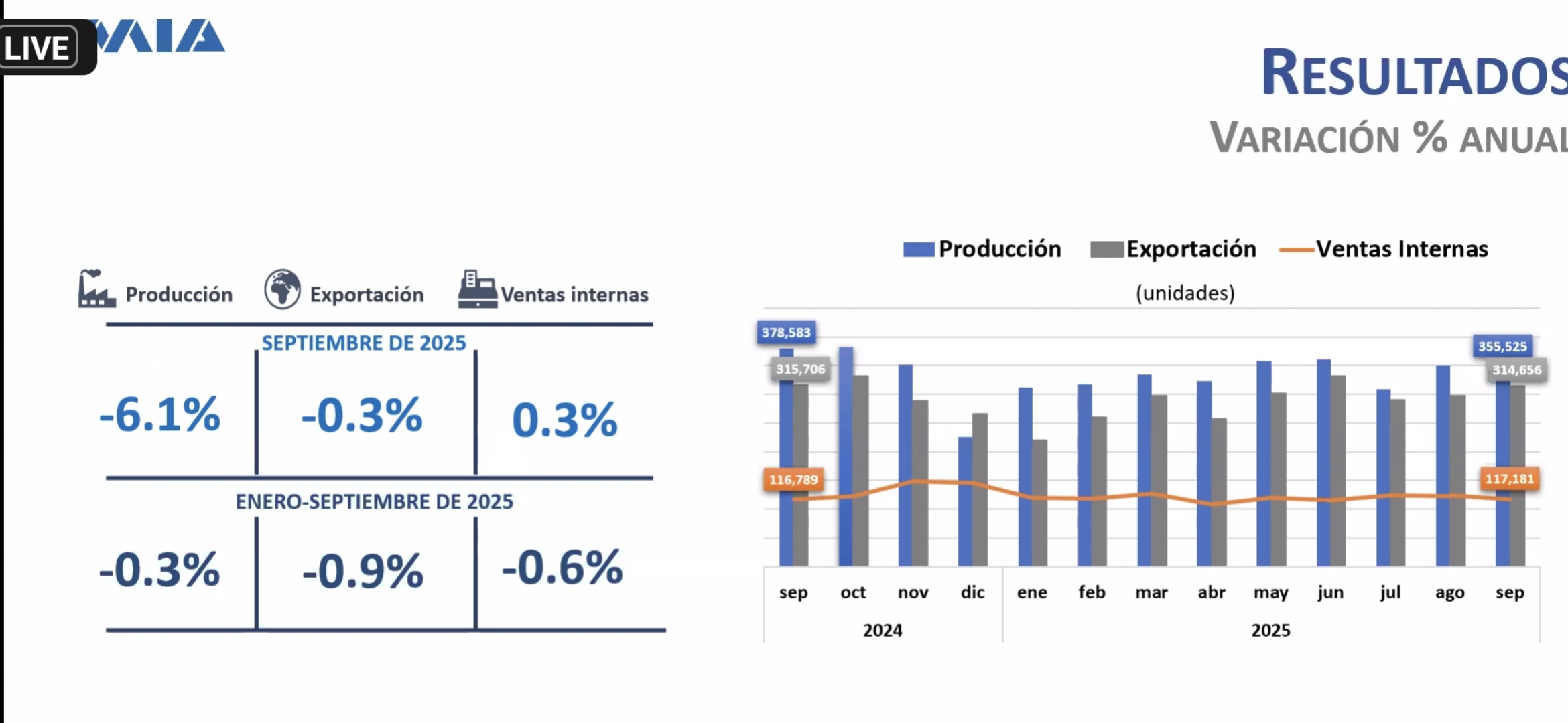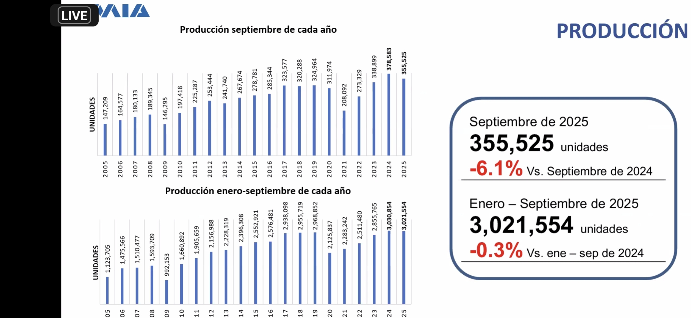 En el acumulado de enero a septiembre, se han producido más de 3 millones 021,554 unidades, cifra que refleja un ligero ajuste a la baja de 0.3% respecto al mismo periodo de 2024.