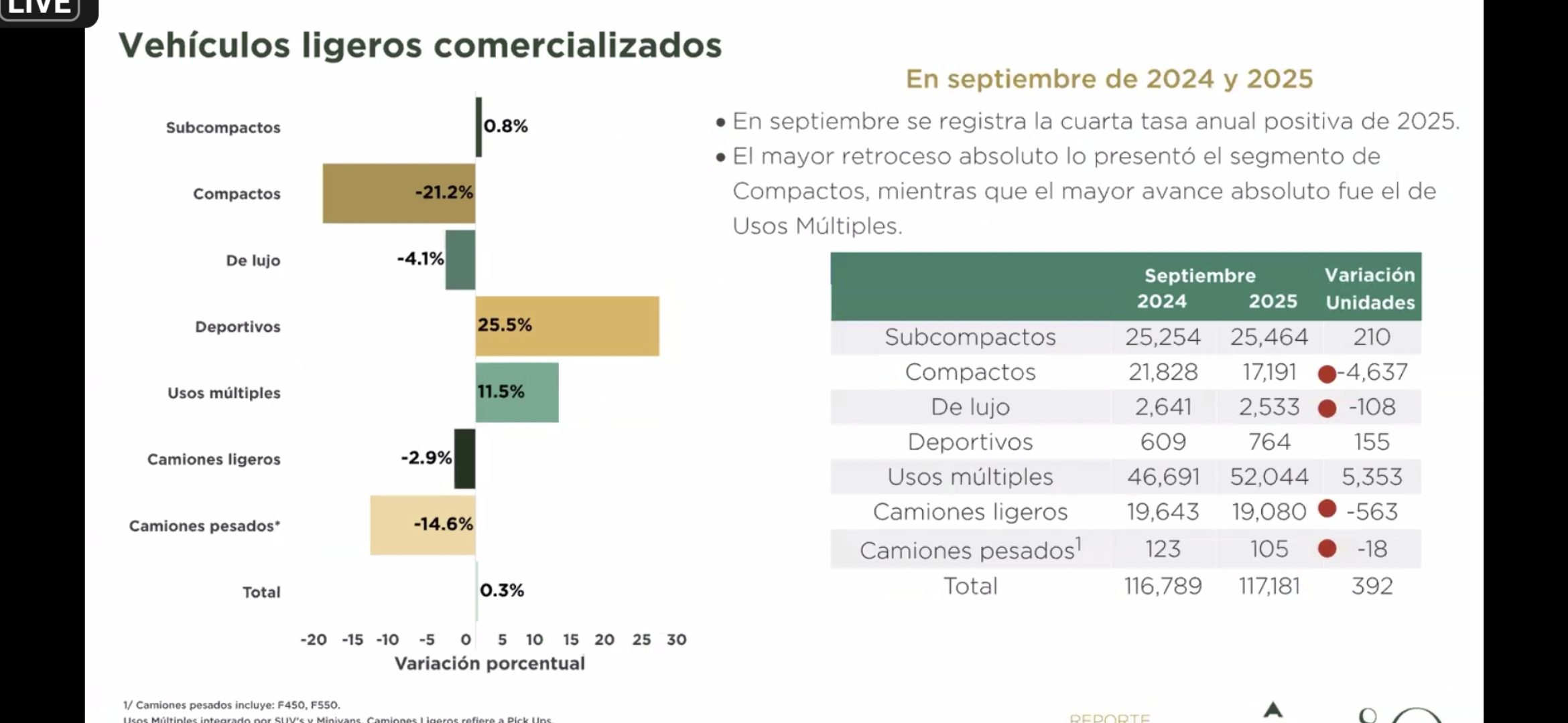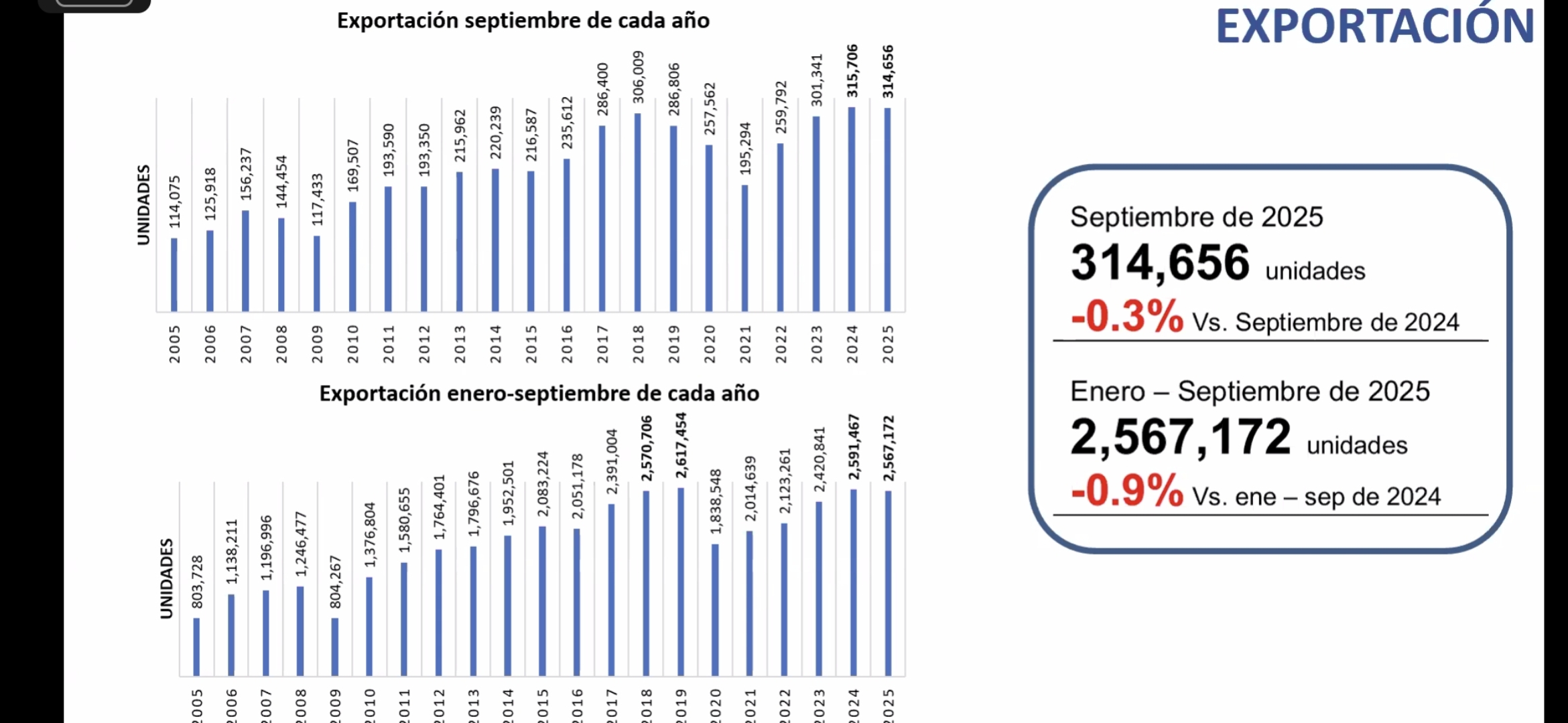 En cuanto a las exportaciones, durante septiembre se registró una ligera contracción de 0.3%, con 314,656 unidades enviadas al extranjero. Este volumen representa el segundo mejor resultado histórico para un mes de septiembre, solo superado por el del año anterior.