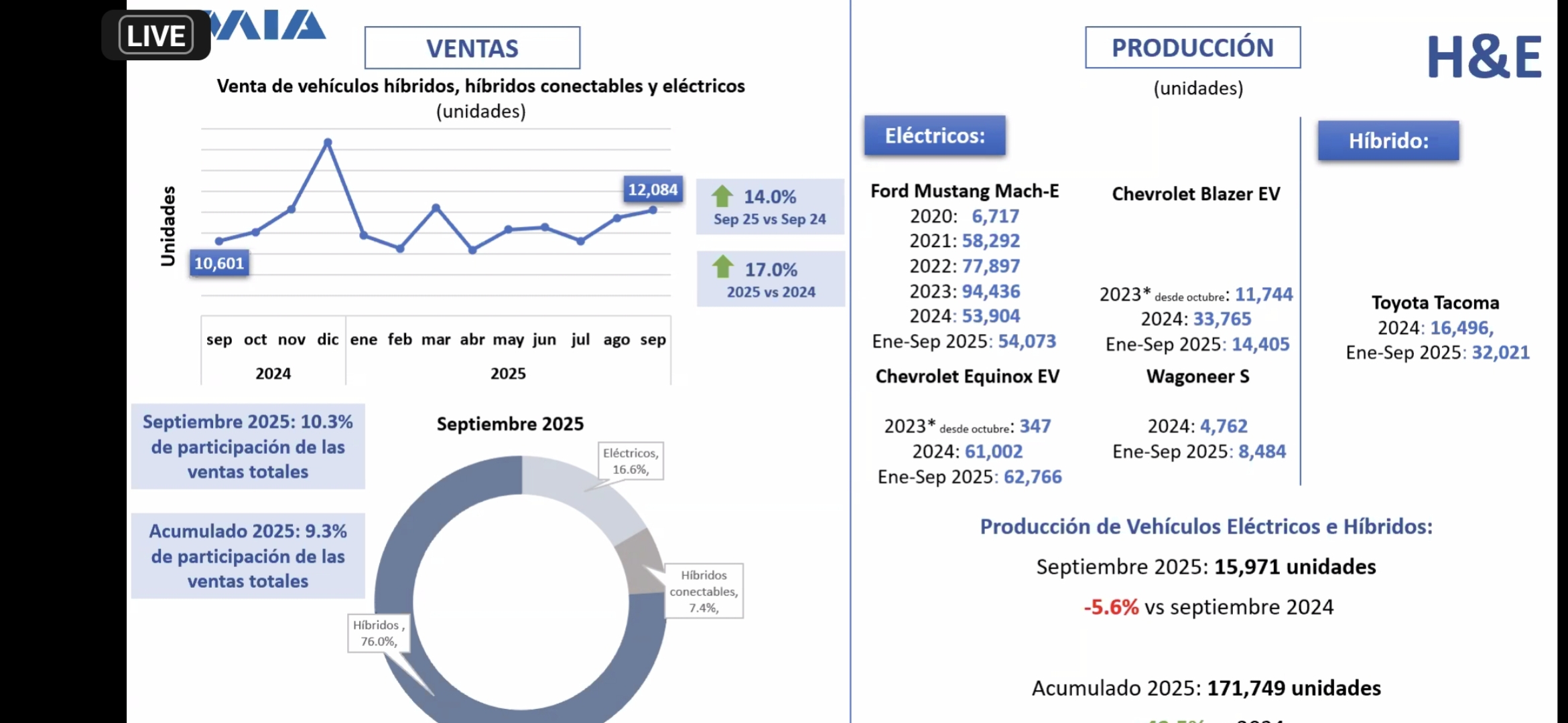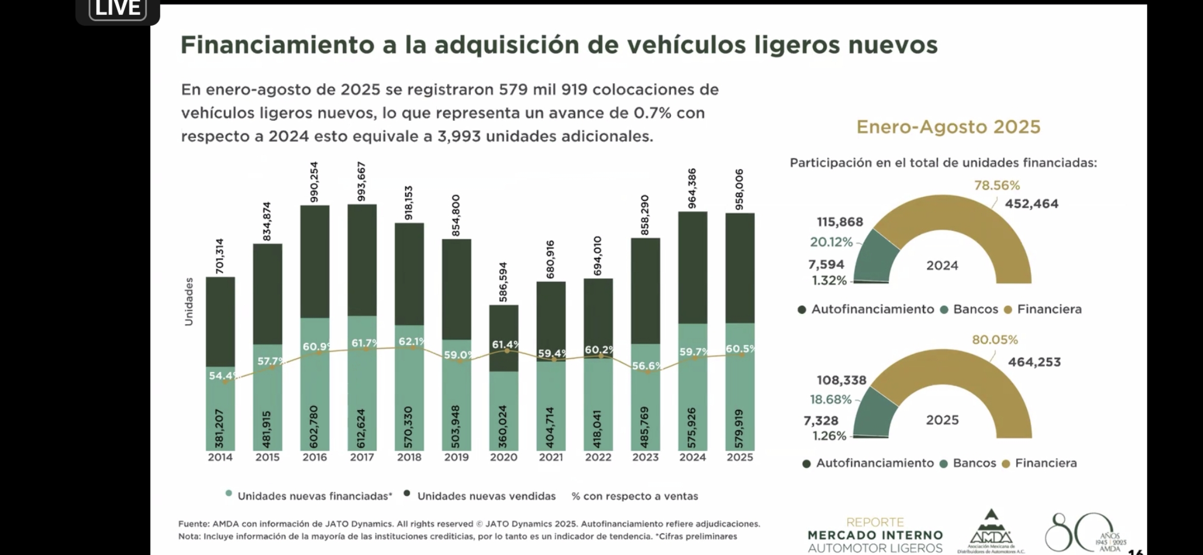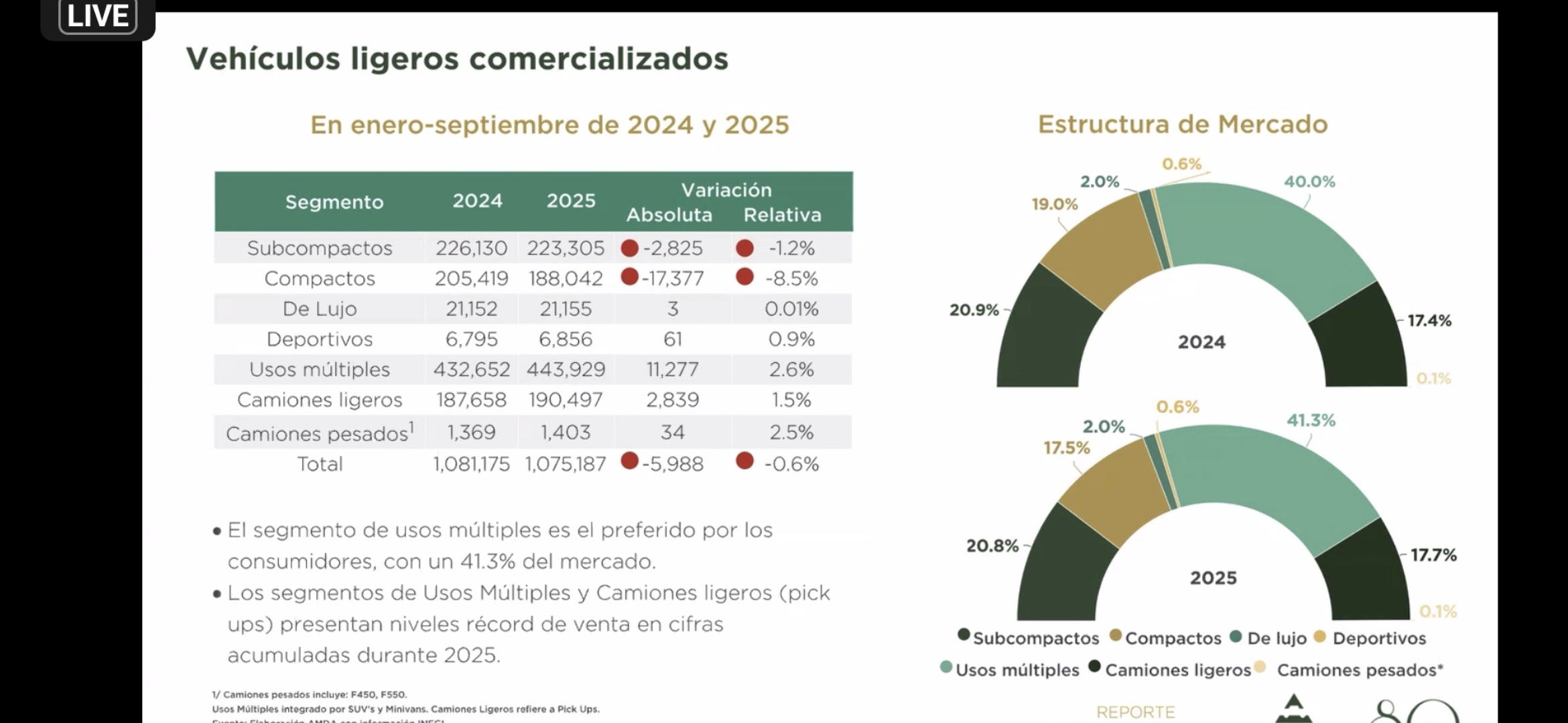 En el acumulado de lo que va del año, se han exportado más de 2 millones 567,172 unidades. Aunque esta cifra implica una disminución de 0.9% respecto al mismo periodo de 2024, el desempeño de enero a septiembre de 2025 se mantiene estable y sólido frente a la coyuntura internacional, dijo Adriana Ramírez, del área de Estudios Económicos de la Asociación Mexicana de la Industria Automotriz (AMIA), en conferencia de prensa.