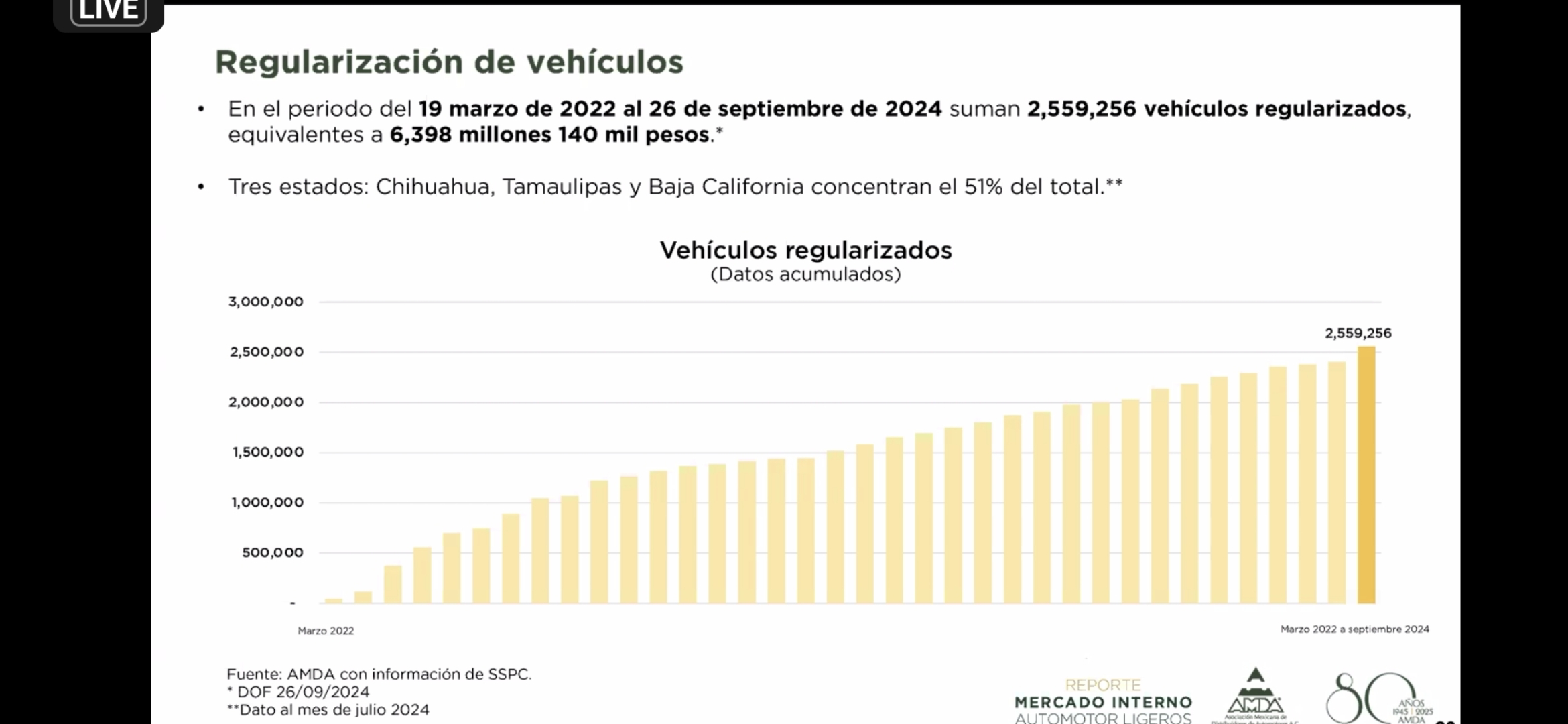 Finalmente el ejecutivo de la AMDA, dijo que las importaciones de vehículos usados totalizan dos millones 559,256 unidades del 19 de marzo del año 2022 al 26 de septiembre de este año, lo que no deja de ser una cifra por demás alarmante.
