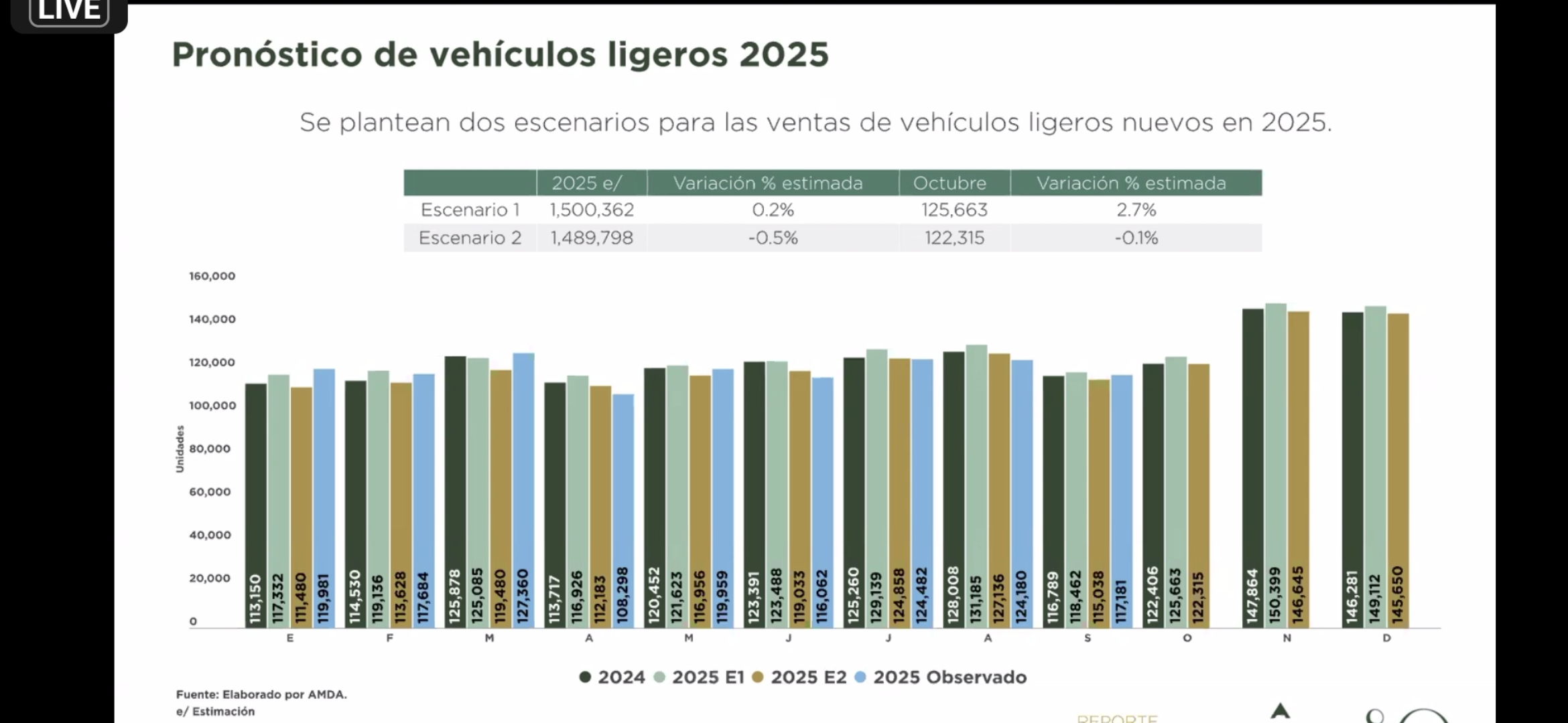 Sin embargo, en las ventas anualizadas de los últimos 2 meses (octubre del 2024 a septiembre de este año) es de un millón 491,798 unidades, y con ello se estima un cierre de año de casi 1.6 millones, y en sel segundo escenario sería de un millón 490,000 ventas, dijo Guillermo Rosales, presidente de la Asociación Mexicana de Distribuidores de Automotores (AMDA).