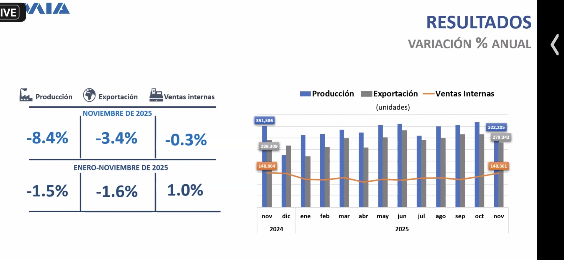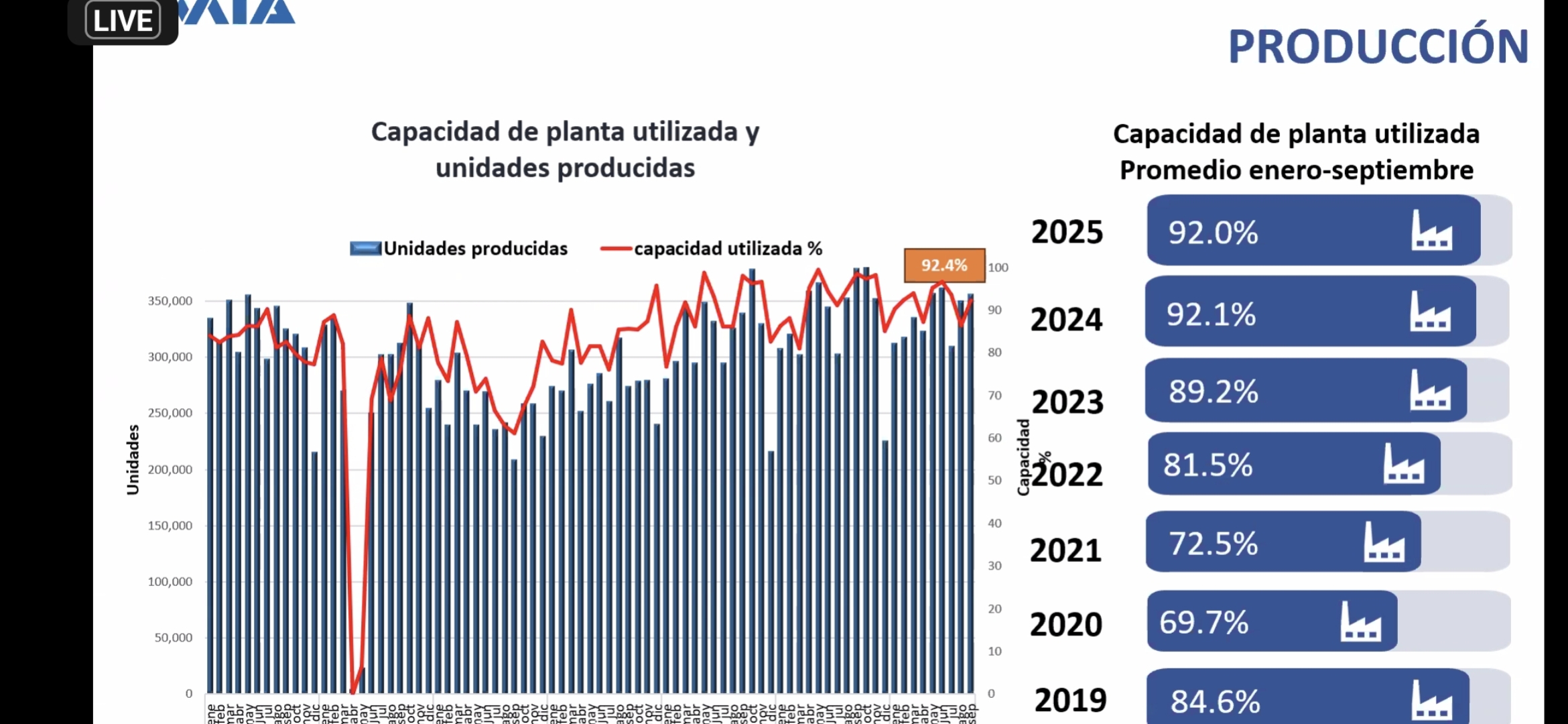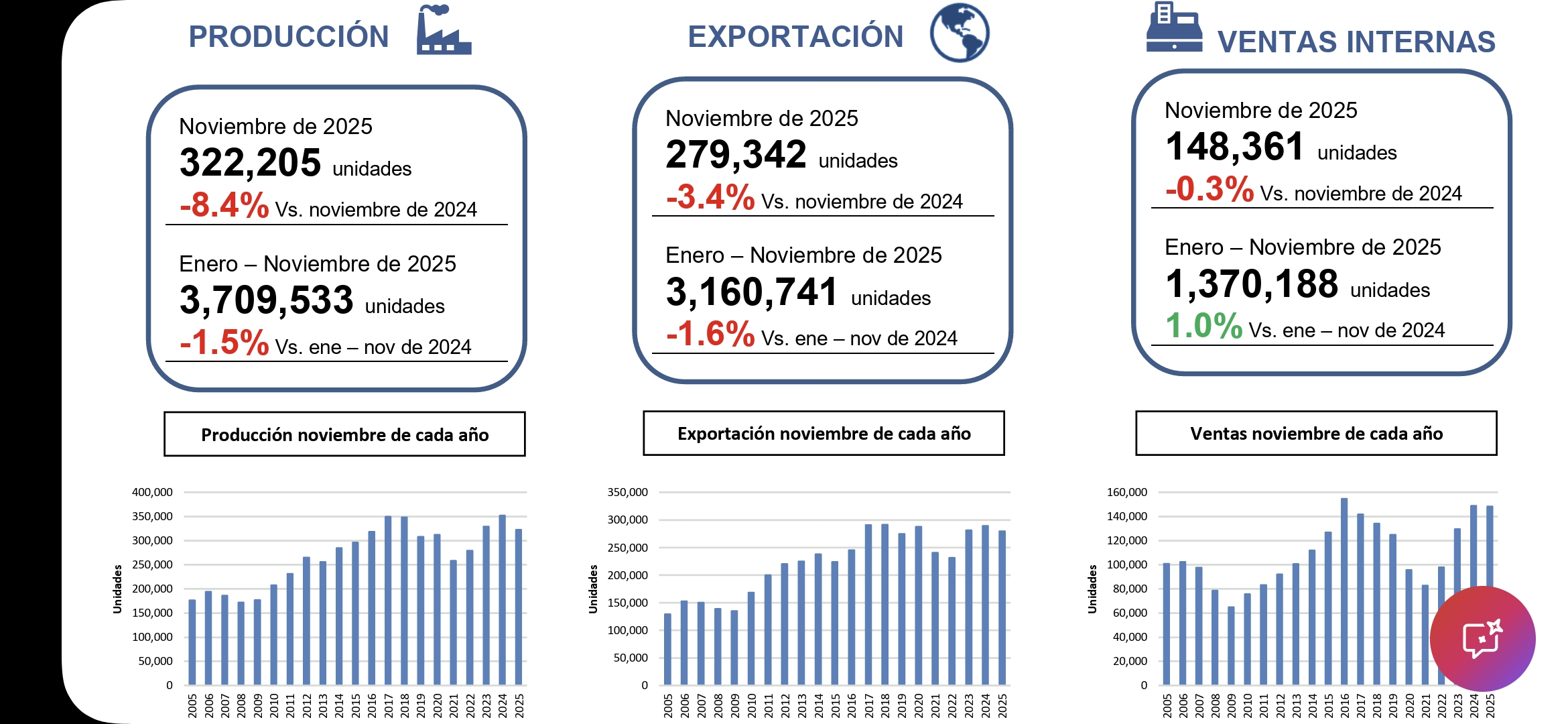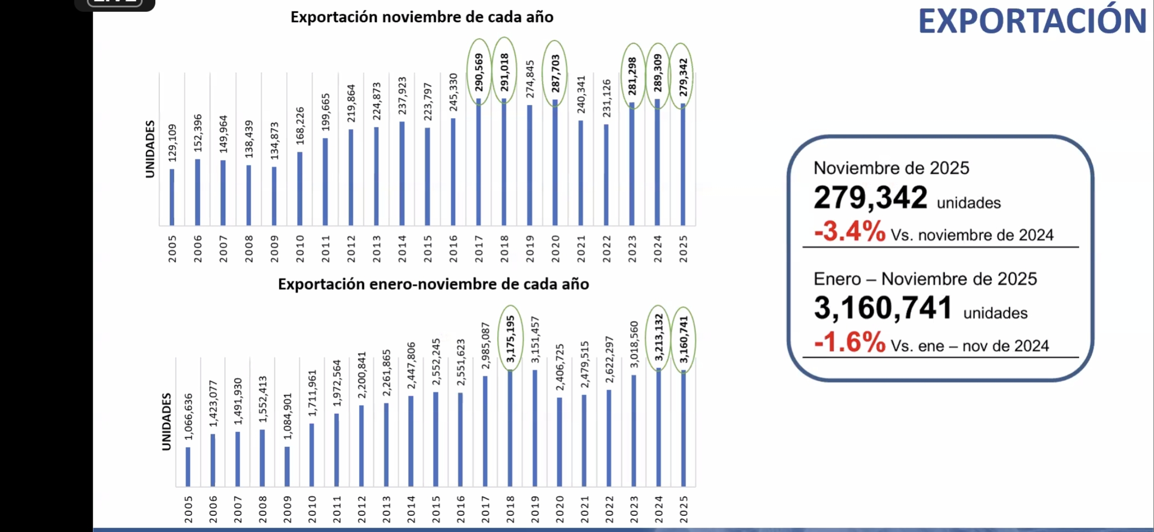 En cuanto a las exportaciones, durante noviembre se registró una contracción de 3.4%, con 279,342 unidades enviadas al extranjero. En el acumulado de enero a noviembre, se han exportado más de 3.1 millones de unidades; a pesar de una ligera disminución de 1.6% respecto al mismo periodo de 2024, coloca a 2025 como el tercer mejor registro histórico para dicho periodo.
