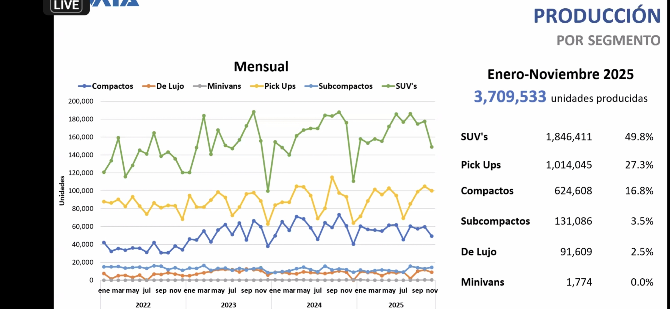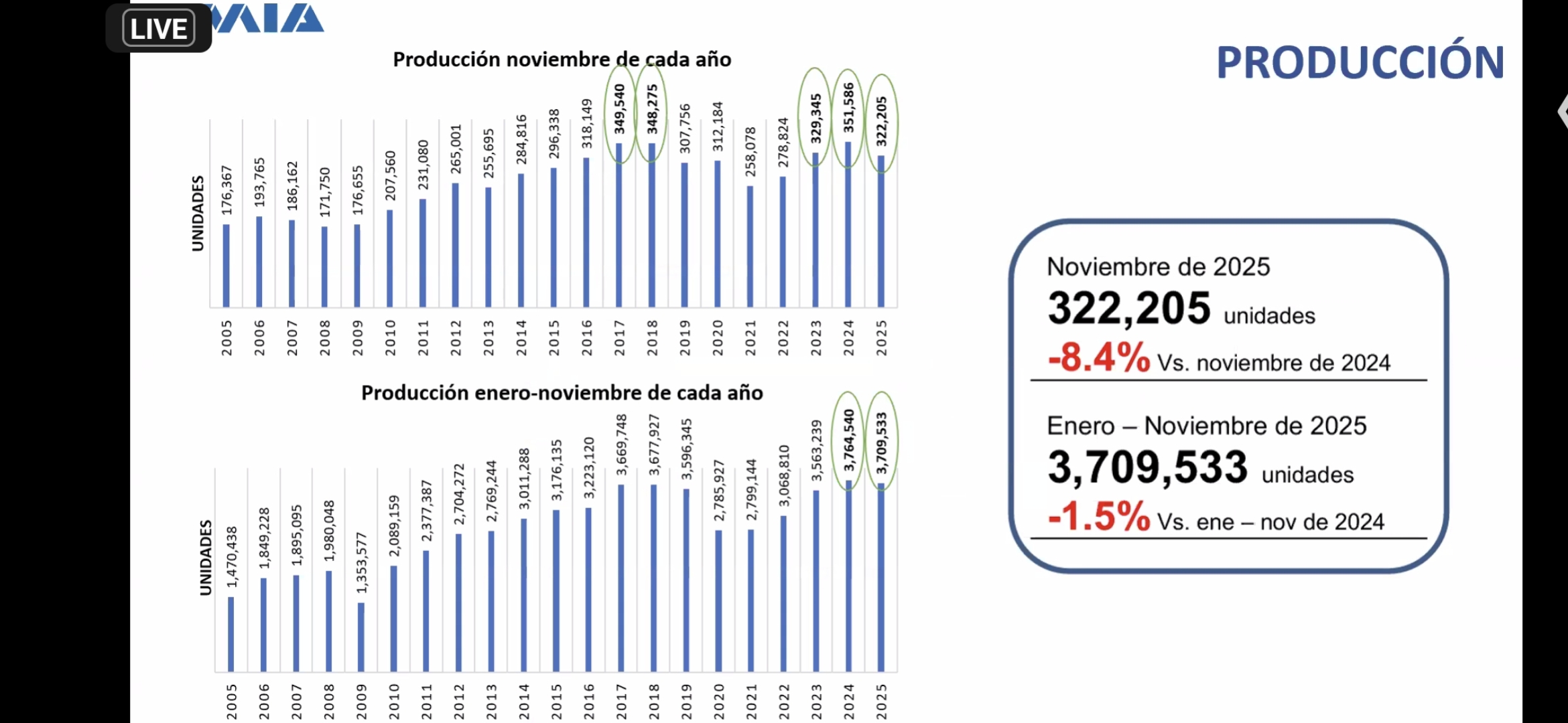 Durante noviembre de 2025, la producción de vehículos ligeros en México alcanzó 322,205 unidades, lo que representa una reducción de 8.4% en comparación con el mismo mes de 2024; en el acumulado de enero a noviembre, se han producido más de 3.7 millones de unidades, cifra que refleja un ligero descenso de 1.5% respecto al mismo periodo de 2024.
