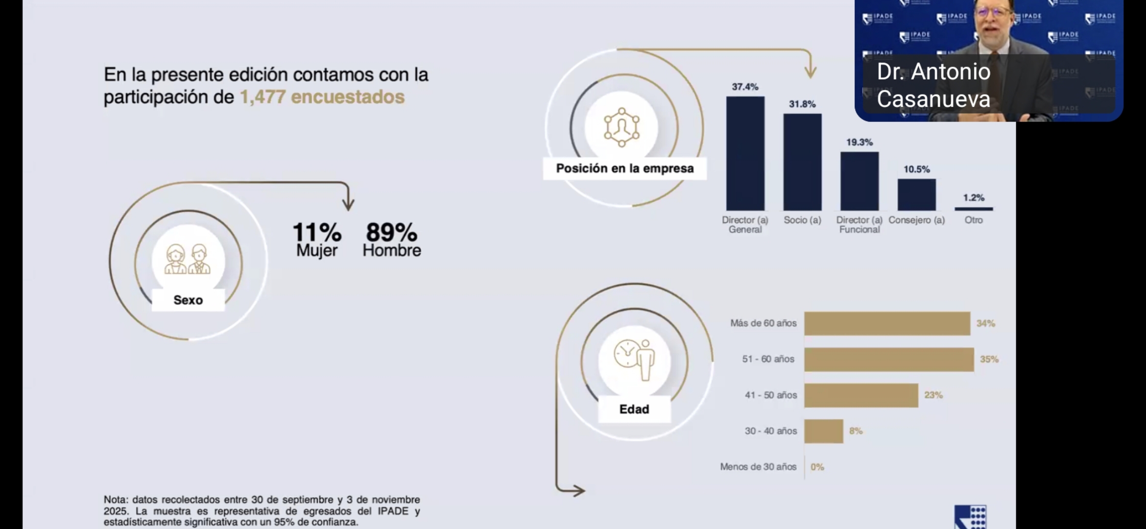 El nivel de optimismo como la perspectiva de inversión de los empresarios egresados del IPADE ha empeorado respecto a sus expectativas de inicio del 2025, lo anterior de acuerdo a una encuesta de «Expectativas Empresariales» en un levantamiento realizado desde el 2020 para evaluar el sentir de los empresarios y directivos sobre el ecosistema empresarial.