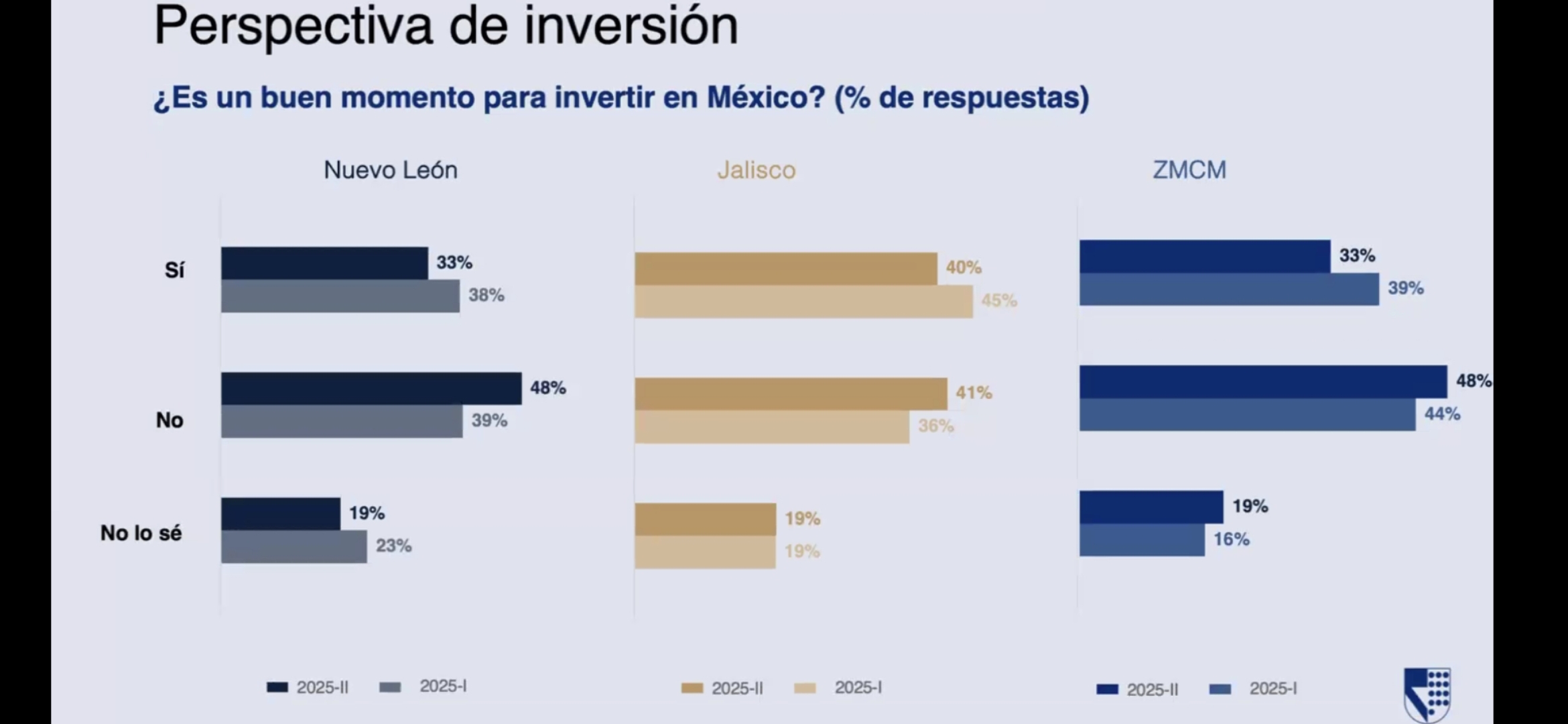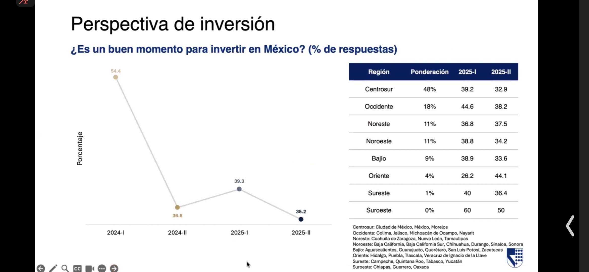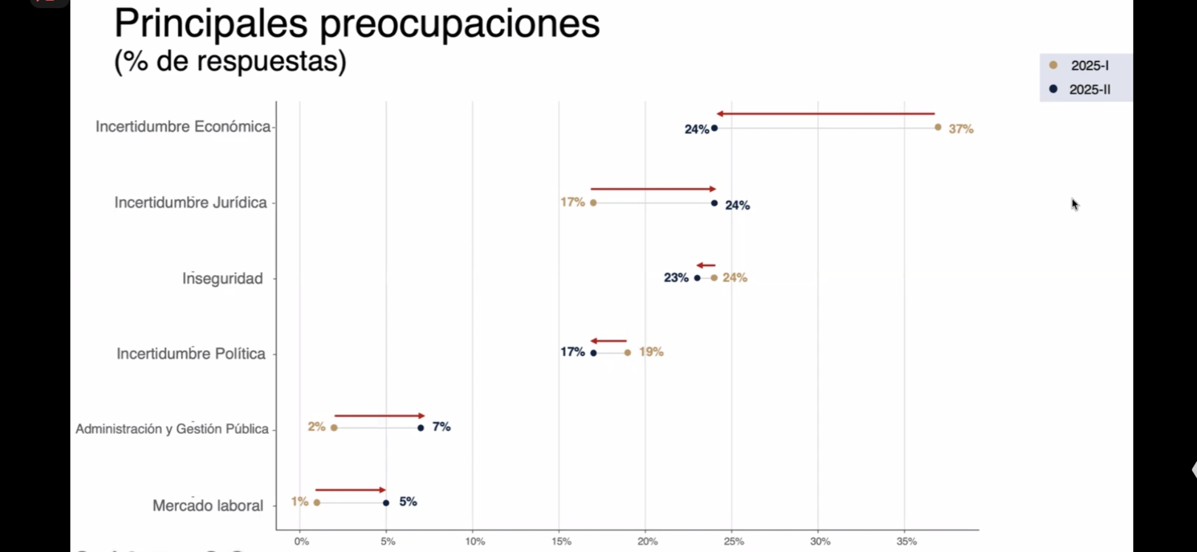 «Así es que la incertidumbre jurídica y económica paraliza la inversión. Solamente el 35.2% considera que es buen momento para invertir en México. Y semestre a semestre, la inseguridad es un tema que sigue presente en las preocupaciones del empresariado.