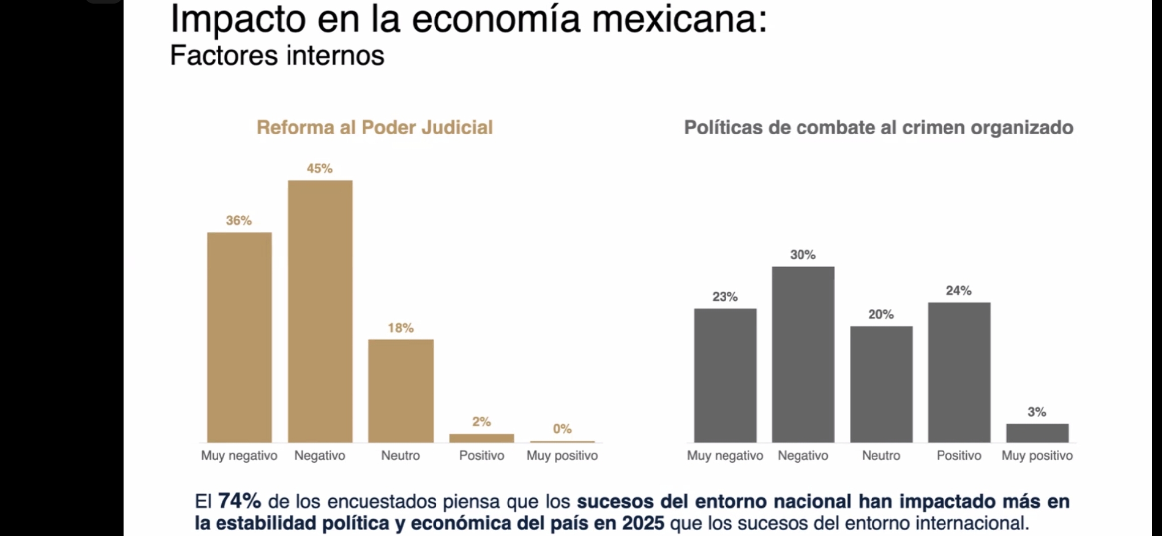 «Asimismo, se mantiene la percepción de que los E.U. es principalmente una fuente de incertidumbre de la economía mexicana. Y la reforma jurídica y las políticas de combate al crimen organizado quitan el sueño a los empresarios encuestados».