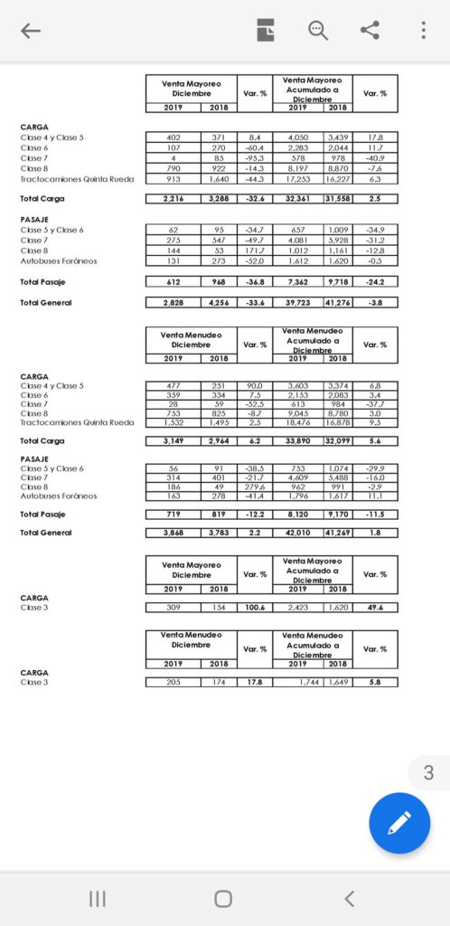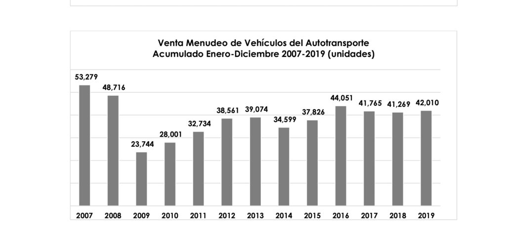 La Asociación Nacional de Productores de Autobuses, Camiones y Tractocamiones (ANPACT), informó que, durante el mes de diciembre, la venta al mayoreo de vehículos pesados y comerciales alcanzó un total de 2,828 unidades, que comparadas con las 4,256 registradas en diciembre de 2018, representa una caída del 33.6%.