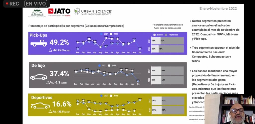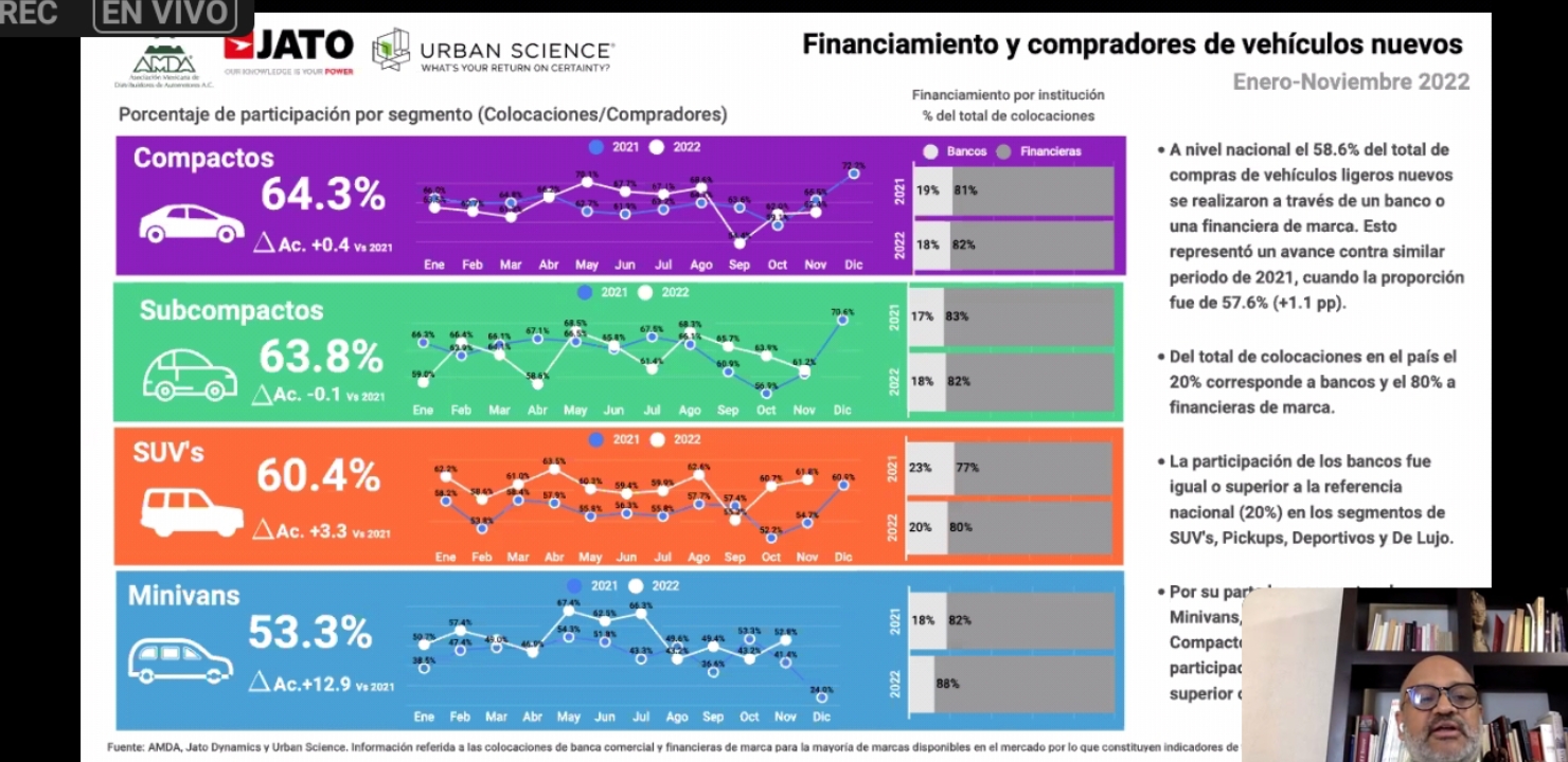 “Cuatro segmentos presentan avance anual en el indicador acumulado al mes de noviembre de 2022: Compactos, SUVs, Minivans y Pick-ups”, expuso Guillermo Rosales Zárate.