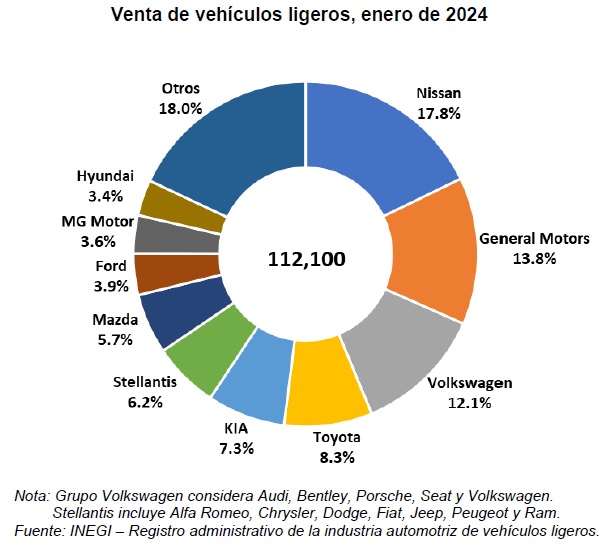 En enero de 2024 la venta de vehículos ligeros nuevos fue de 112,100 unidades, 18.7% mayor al número de unidades comercializadas en enero de 2023.