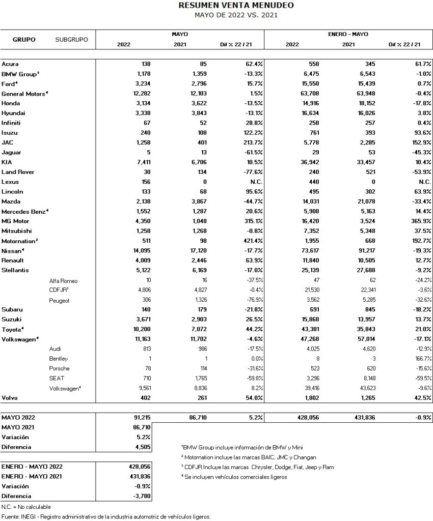 En mayo de este año 2022, las ventas de vehículos ligeros nuevos fueron de 91,215 unidades, 5.2% mayor al número de unidades comercializadas en mayo de 2021.