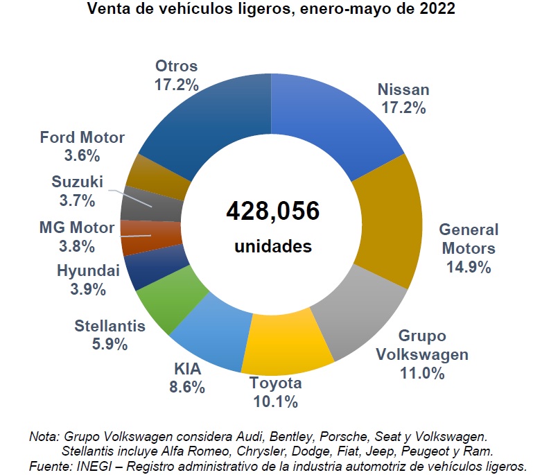 En el acumulado enero-mayo de 2022 se registraron 428,056 vehículos ligeros nuevos vendidos, lo que representa una reducción de 0.9% con respecto a lo reportado durante el mismo periodo de 2021.