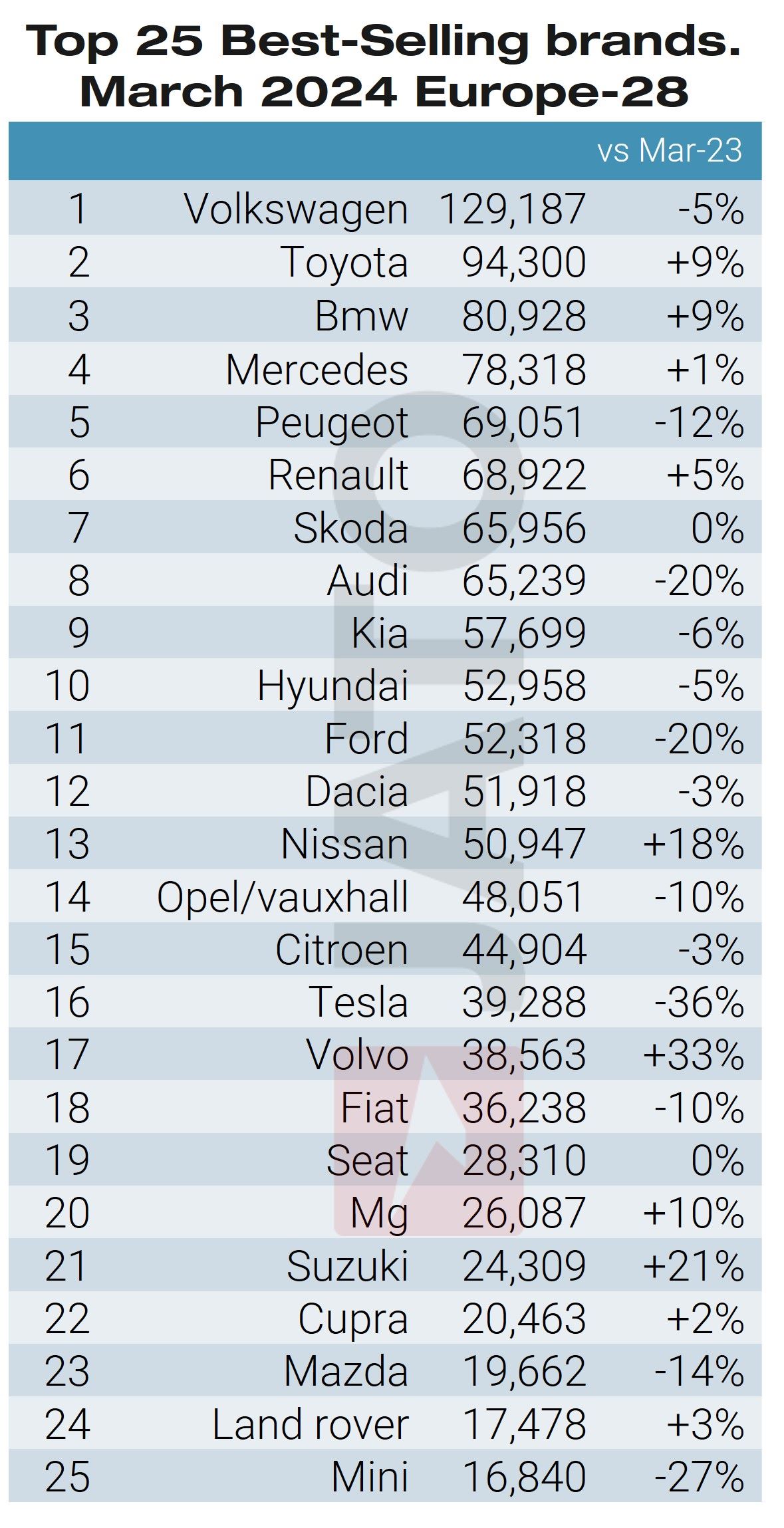 En estas cifras, la marca MG contabilizó el 61%, BYD con el 24% (2,892 uinidades), Great Wall con el 5.0%. Y Tesla en ese mercado europeo con 39,000 unidades registradas en marzo.