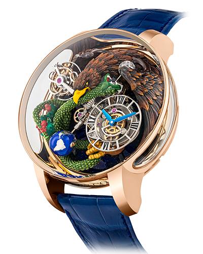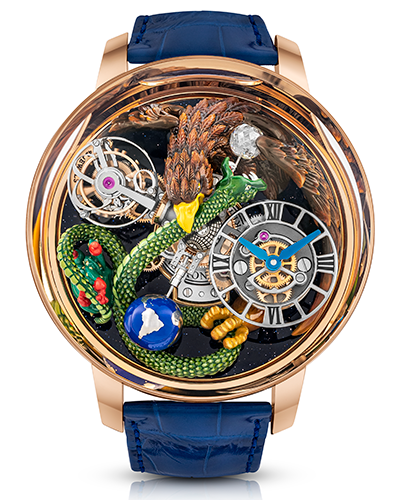 El famoso reloj Astronomia de Jacob & Co ha tenido una importante fuerza de inspiración para los relojeros que crean un ambiente propicio tanto para flores hasta serpientes como es el caso de esta pieza única para México. Descúbrela aquí…