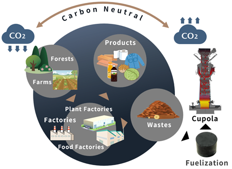 Bajo esta idea, el equipo de investigación y desarrollo de Mazda en Japón puso a prueba uno de sus hornos de fusión con cúpula[1] dentro de la planta de Hiroshima sustituyendo los combustibles fósiles, los cuales emiten CO2 durante la combustión, por bloques de biomasa, la cual está creada a partir de cáscara de coco.