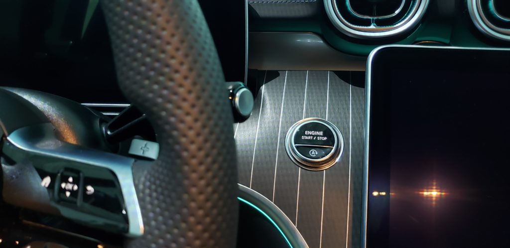 La línea AMG también está presente en el interior del nuevo Clase C y se puede apreciar en el diseño del volante con controles sensibles al tacto, los pedales con acabado cromo y tapetes AMG Line.
