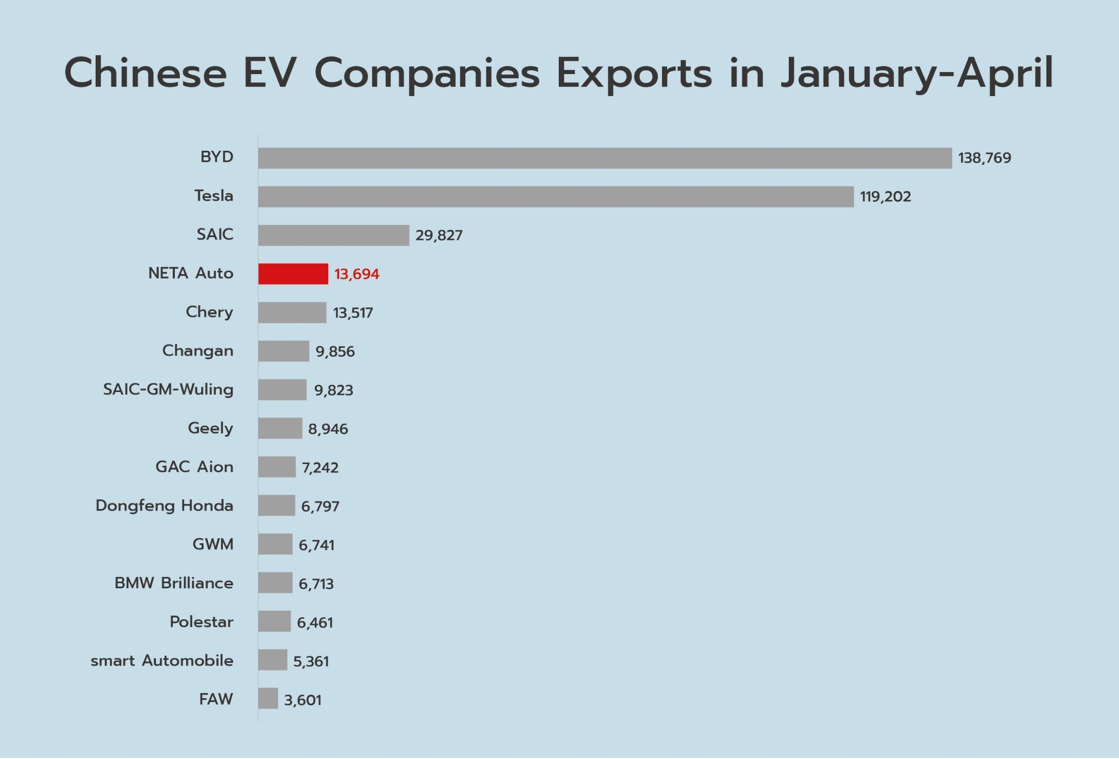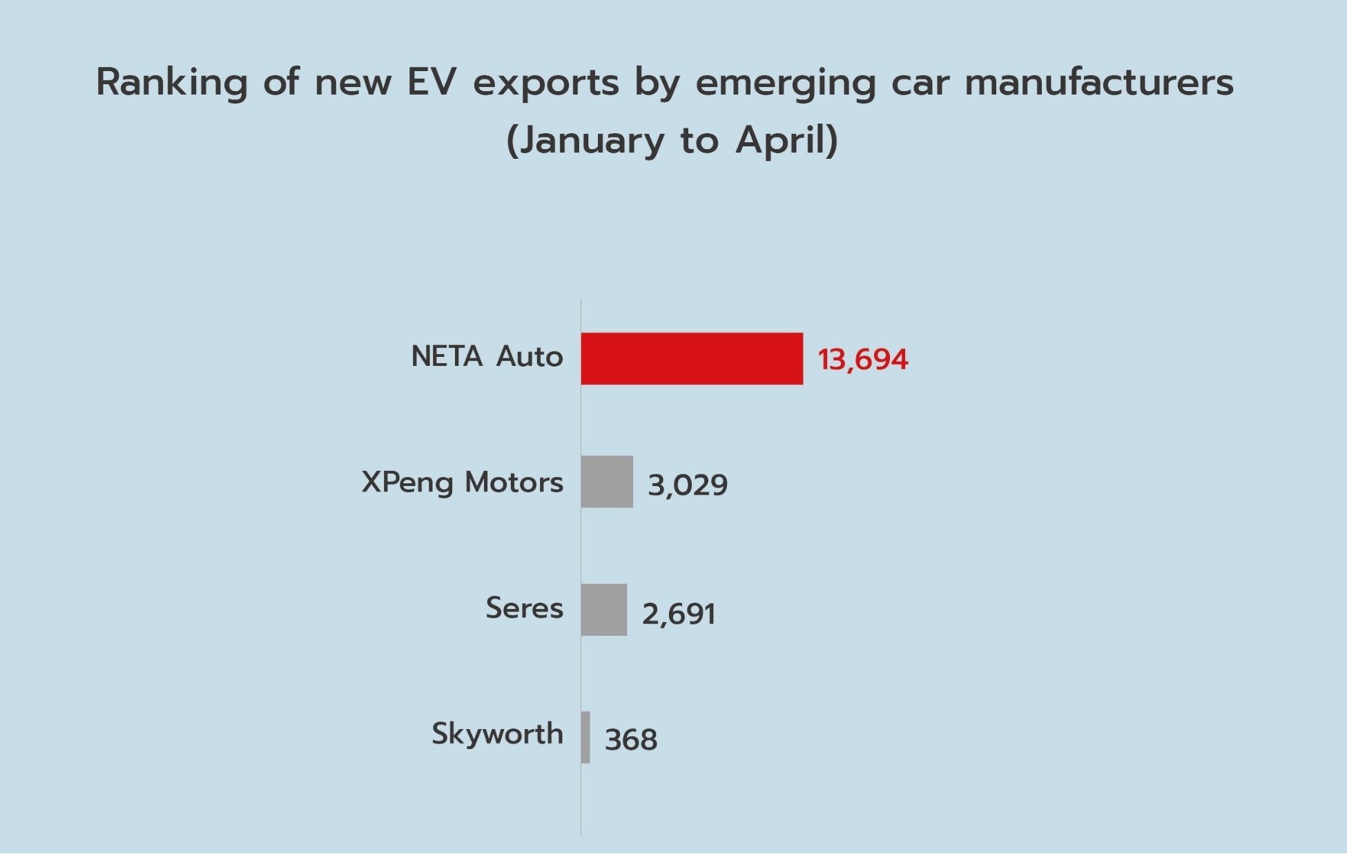 De enero a abril de 2024, NETA Auto exportó 13,694 vehículos eléctricos, posicionándose en el cuarto lugar entre todas las empresas de vehículos eléctricos de origen chino, y la primera entre las nuevas compañías de automóviles.
