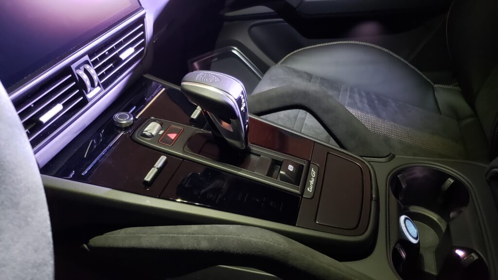 Un techo con el contorno de carbono y extensiones negras en los guardabarros, junto con los rines GT Design de 22 pulgadas en color Neodyme, dominan la vista de perfil. Las placas laterales de carbono instaladas longitudinalmente en el spoiler de techo son específicas del GT, igual que el labio del spoiler trasero extensible, que es 25 milímetros más grande que en el modelo Turbo.
