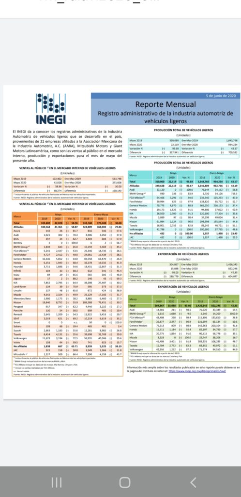 Lo anterior con base a información del INEGI con datos de la Industria Automotriz de vehículos ligeros que se desarrolla en el país, provenientes de 21 empresas afiliadas a la Asociación Mexicana de la Industria Automotriz, A.C. (AMIA), Mitsubishi Motors y Giant Motors Latinoamérica.