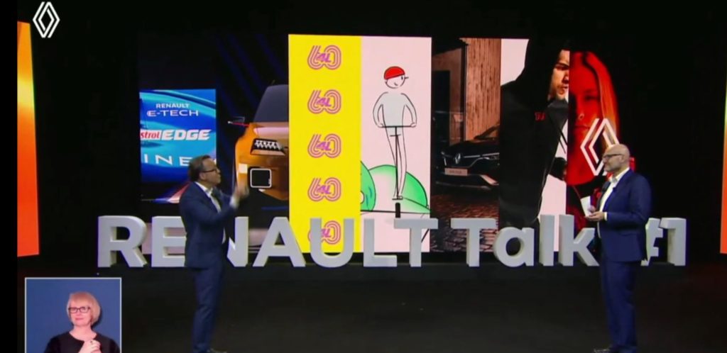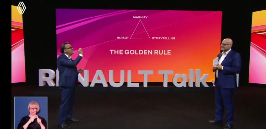 En la denominada Primera Charla (Renault Talk #1), Luca de Meo en calidad de Presidente y Director General de la marca, y su equipo compartieron la visión de la marca, una con la recuperación del Grupo y la estrategia Renaulution, se presentó la visión de la marca: un líder en transición energética, a la vanguardia de las últimas tecnologías y servicios, operando de manera más sostenible y responsable.