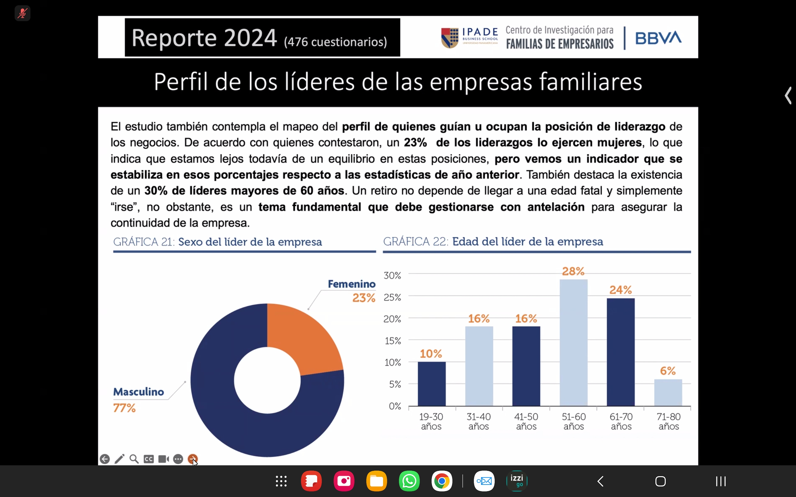 El informe de 2024 revela dos retos: que aún hay una brecha de género inminente, pues sólo 23% de las empresas familiares son dirigidas por mujeres, y que 30% de los líderes de empresas familiares tiene más de 60 años, lo que plantea un desafío de renovación generacional, pues México presenta un menor índice de empresas familiares en tercera generación (9%) frente al estándar internacional (11%).