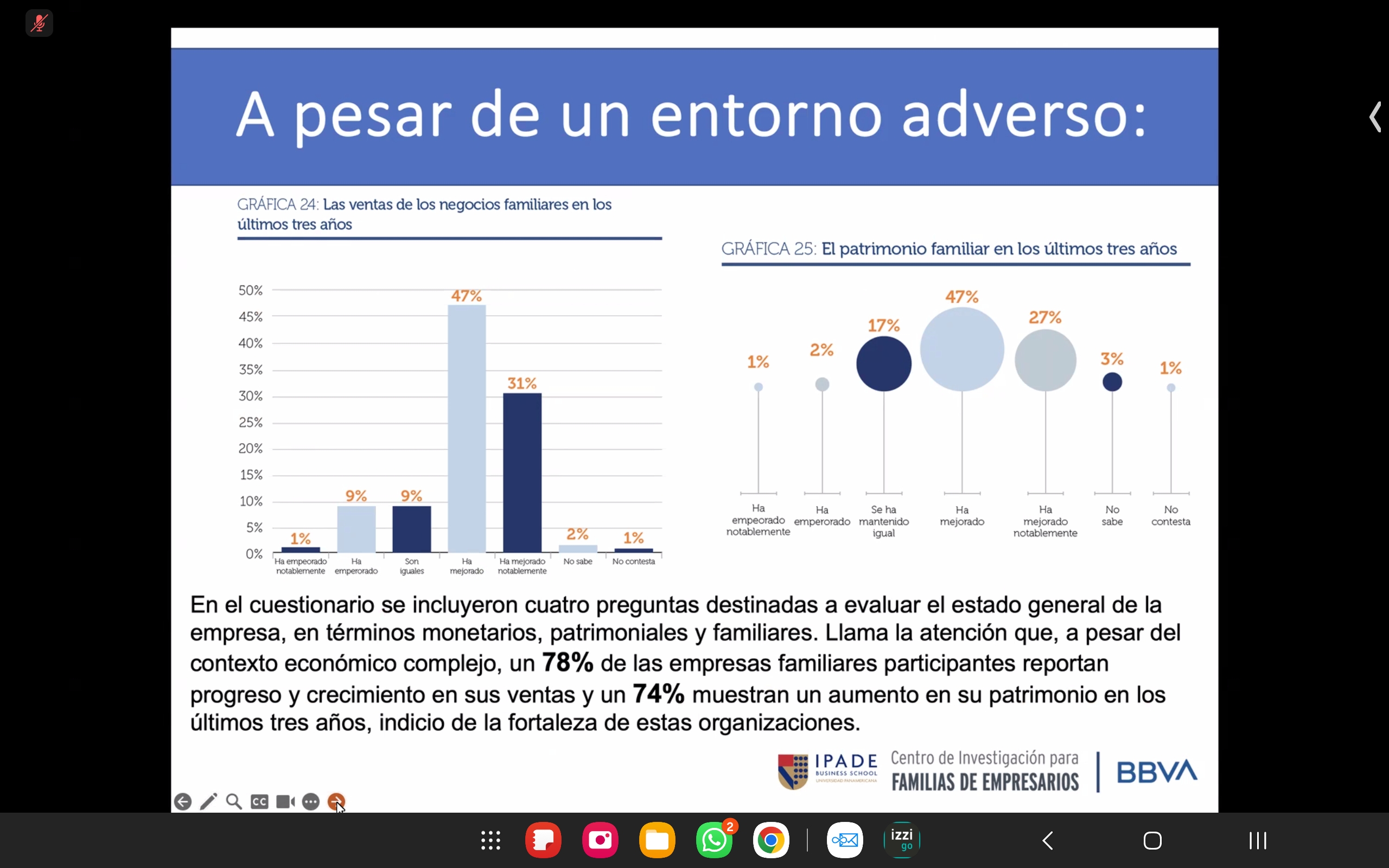 Por otro lado, el informe muestra que hay un buen desempeño financiero en las empresas familiares, aunque con poca distribución de dividendos: no obstante 78% reportó crecimiento en ventas y 74% en patrimonio, solo 28% aumentó dividendos, lo que podría generar tensiones con socios.