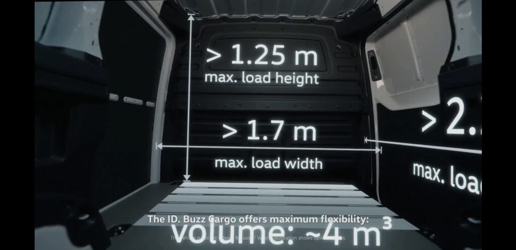 Si la segunda fila de asientos se pliega, la capacidad de carga aumenta hasta 2,205 litros. Dos o tres asientos al frente, según lo desee el cliente, y una división fija que separa el espacio de carga de 3.9 m3 son características distintivas del ID. Buzz Cargo. La versión de carga de cero emisiones puede llevar dos euro pallets, que se cargan transversalmente.