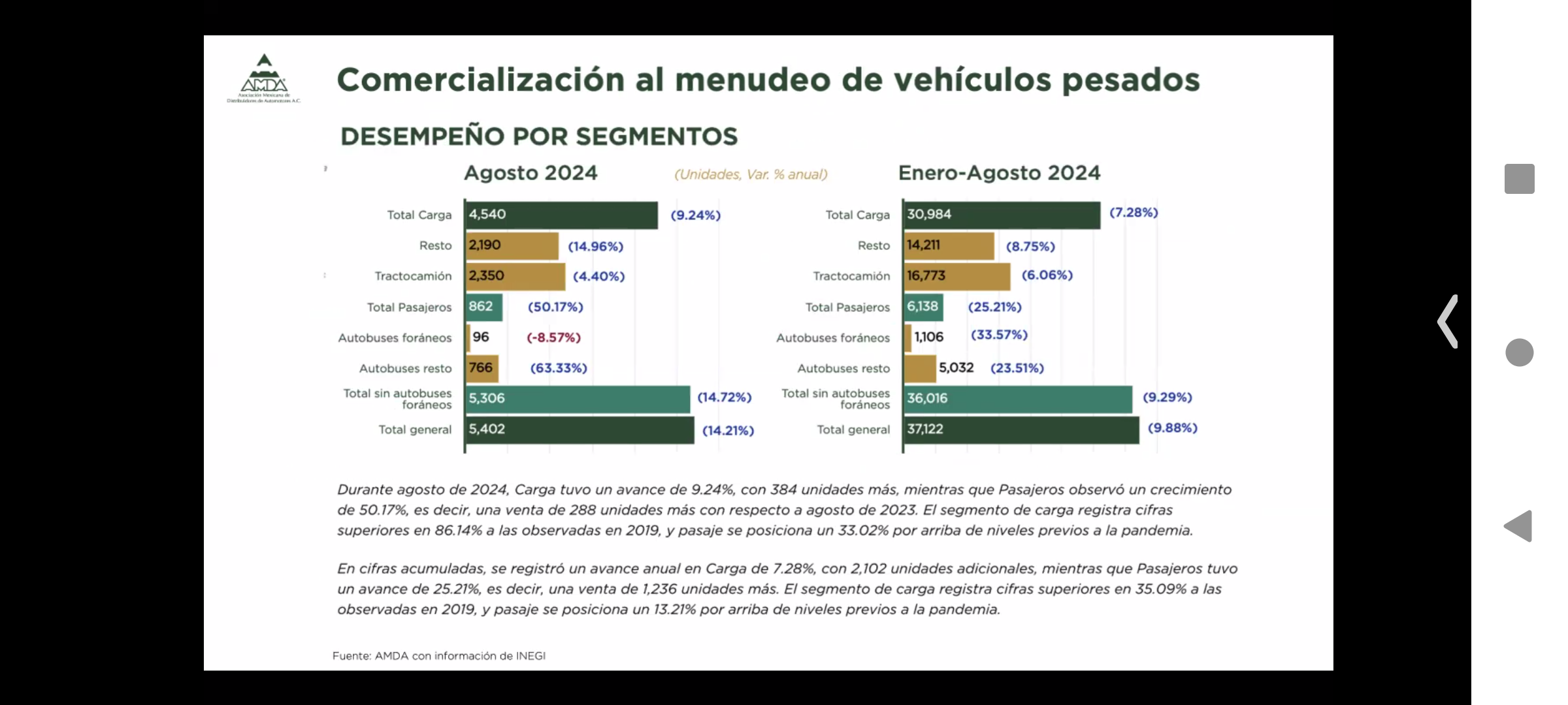 Al continuar su explicación, Arzate indicó que los incrementos a dos dígitos también se repitieron en el acumulado enero-agosto. En carga se vendieron 33 mil 531 unidades al mayoreo y en pasajeros la cifra fue de 6 mil 028 vehículos, es decir, las alzas fueron de 11.5% y 5.8%, respectivamente.