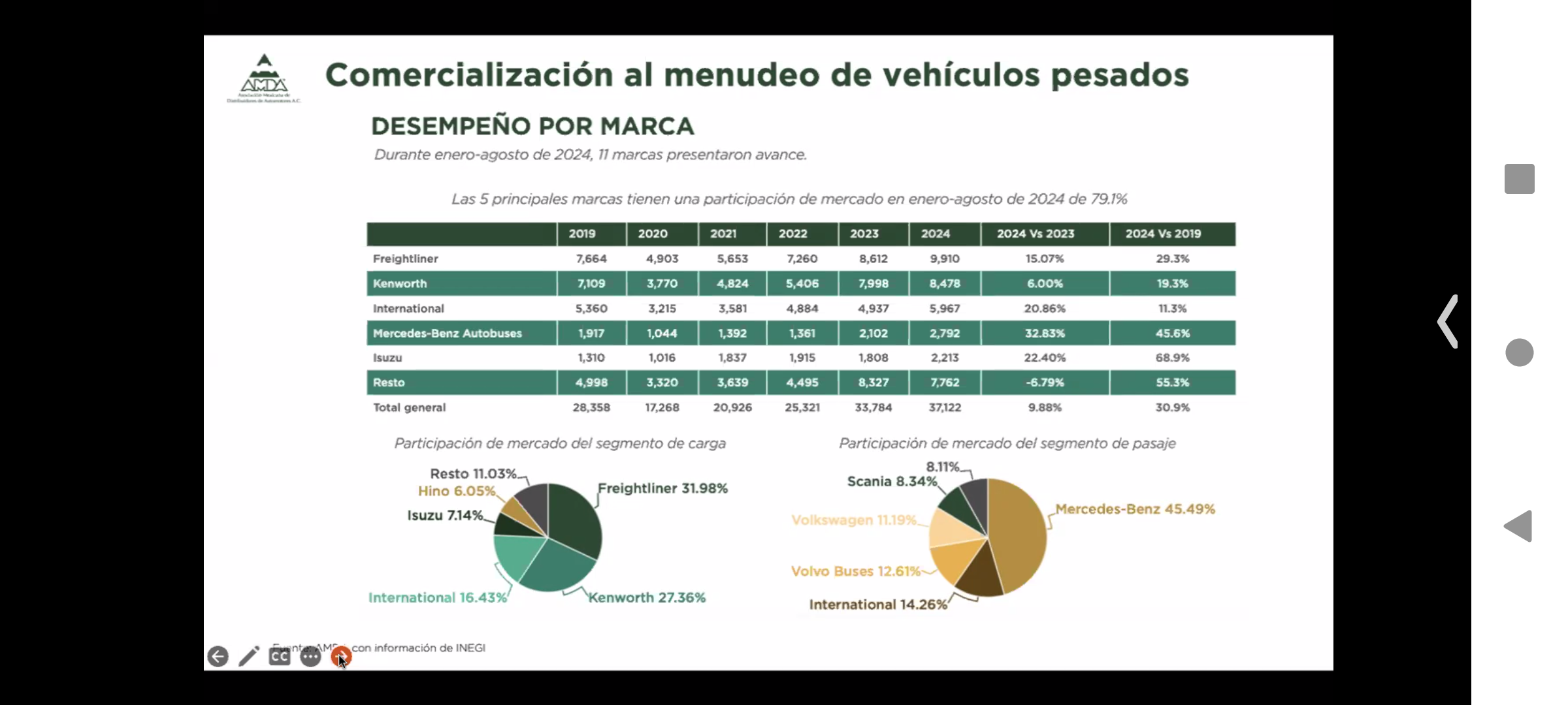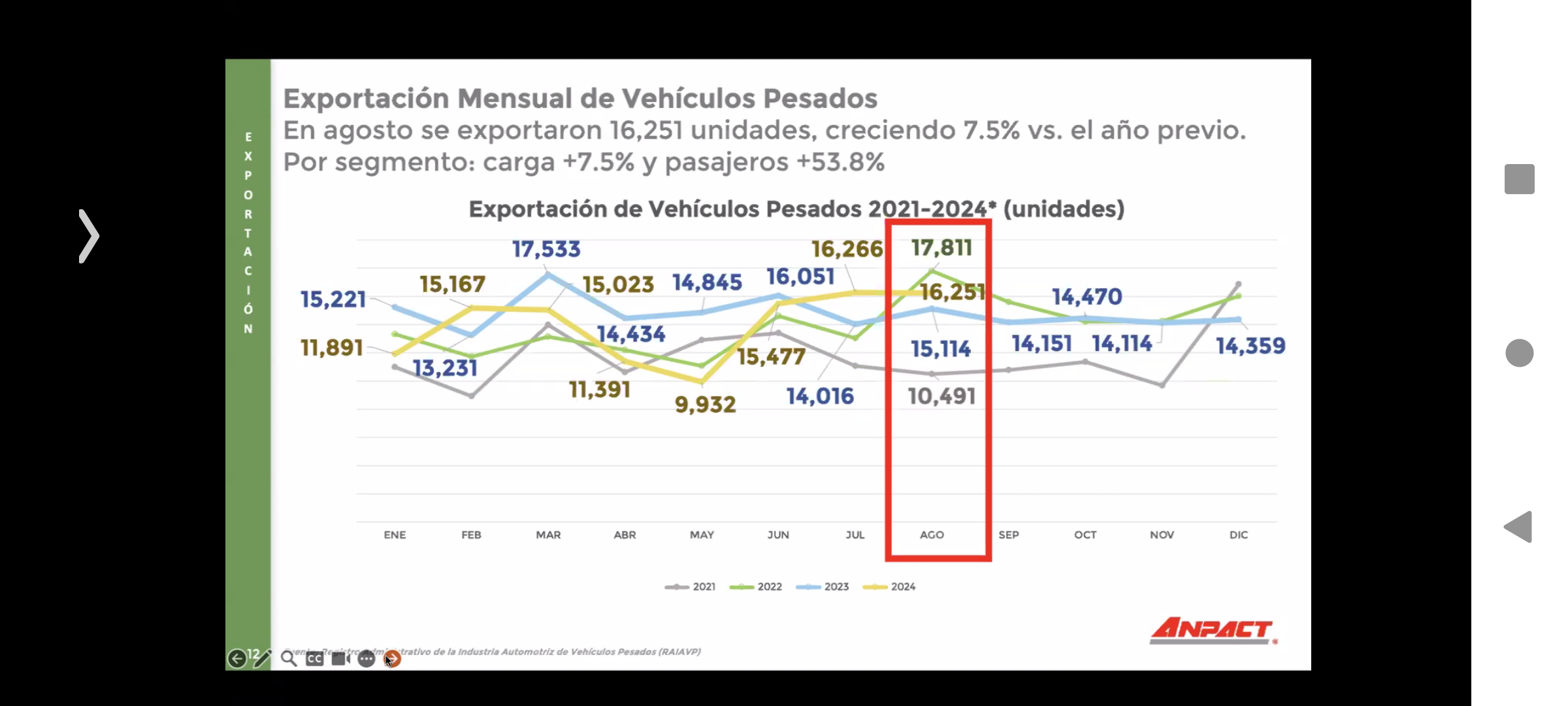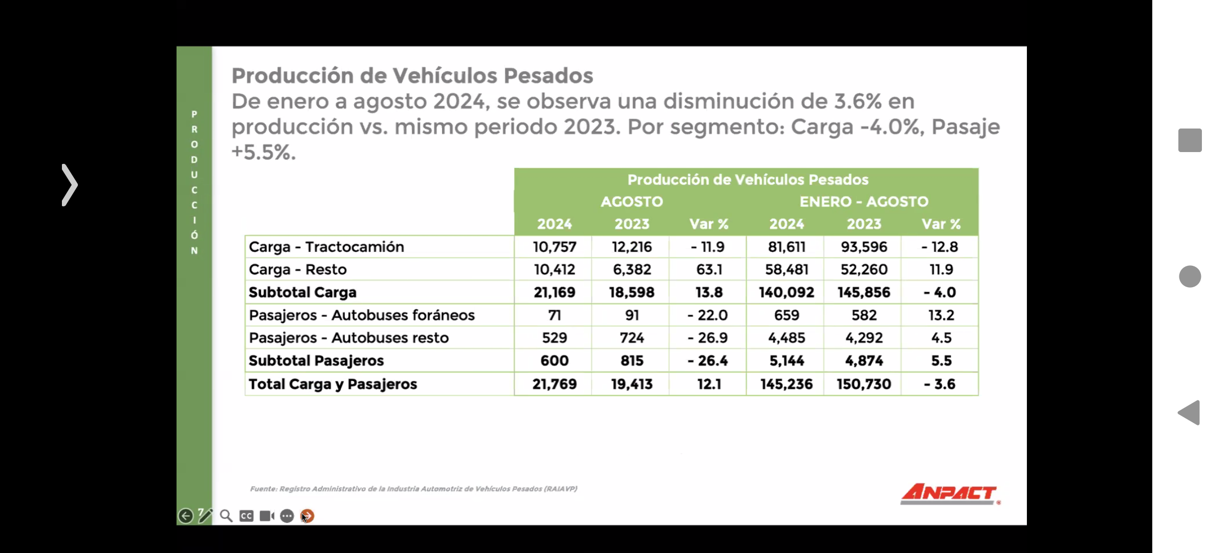 Respecto a la producción de vehículos pesados, se reportaron 21,769 unidades en agosto y 145,236 al considerar los ocho meses ya transcurridos, es decir, que mes a mes crecieron 12.1% y en el acumulado muestran una baja del -3.6%.